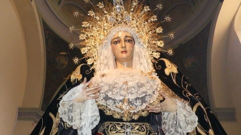 Por otro lado, Nuestra Señora de Soledad estrena un encaje de aplicación de Bruselas como rostrillo y luce también unos puños a juego de la misma técnica y calidad. Porta en su mano un pañuelo de encaje de Bruselas de una delicadeza suprema. Tres piezas del siglo XIX que vienen a engrosar el ajuar de la Soledad para las grandes ocasiones.