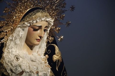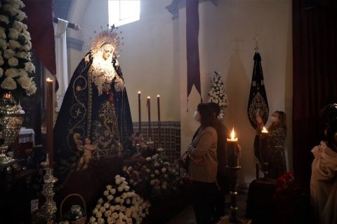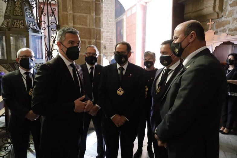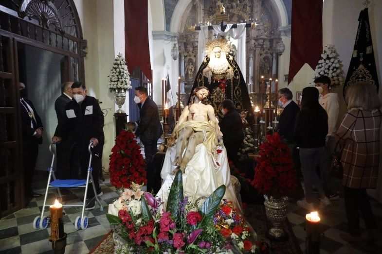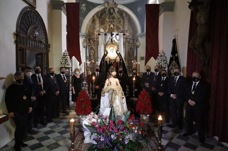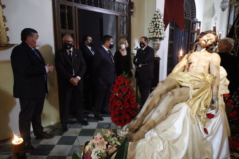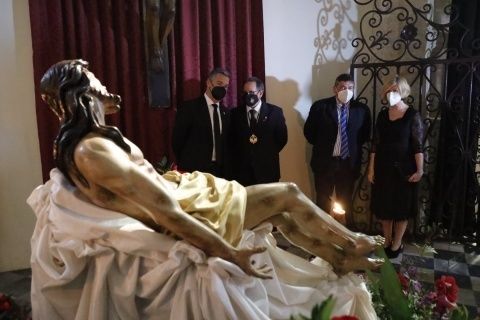 El hermano mayor, Juan Antonio Martín Rodríguez, y miembros de la hermandad, han recibido a los representantes municipales en la parroquia de Nuestra Señora de la O, donde en su capilla están expuestos el Cristo Yacente y Soledad de María Santísima en un altar de veneración que en estos días está recibiendo cientos de visitas.