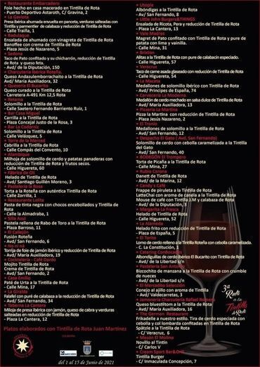 Entre la carta de 42 platos formada por la propuesta individual de cada participante, los ciudadanos podrán degustar carrillá a la Tintilla de Rota, queso curado a la Tintilla de Rota, cabrillas a la Tintilla de Rota, helado de Tintilla, mojito Tintilla de Rota, paté de urta a la Tintilla de Rota, albóndigas a la Tintilla, medallones de solomillo ibérico con Tintilla de Rota, pizza La Martina con reducción de Tintilla de Rota, danett de Tintilla de Rota, frappe de piruleta a la Tintilla de Rota, bizcochito de manzana a la Tintilla de Rota, conejo al ajillo con aroma de Tintilla, queso bluestitltom a la Tintilla de Rota, tintilla burger o helado frito con reducción de Tintilla, entre otras tantas propuestas.