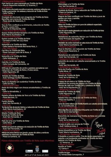 Los establecimientos participantes en esta III Ruta a la Tintilla de Rota son los siguientes: restaurante "El Embarcadero", "La Gaviota", Badulaque, Sedona, Charcutería Ibérica Roteña, Quesería "El Bucarito", bar Retama, bar Casa Miguel, bar La Codorniz, Torre de la Merced, Alambique, Fábrica de Oli, pastelería La Rosa, restaurante Lolita, La Silla Azul, El Callejón, No ni ná, coctelería "El Dardo", Casa Emilio, La Giralda, Taberna La Cantera, Utopía, Little John Burgers&THINGS, Vale Madres, Brixton, Veracruz, La Maceta, cervecería La Moderna, pizzería La Martina, El Tronío, despacho de vinos "El Gato", Bodegón El Trompero, bar Rubio Corona, Candy´s Café, heladería "Margarita La Fresca", La Alameda, El Torito, Catering ConBocados, pastelería San Antonio, Mercadito Selección, Jamonería Charcutería Rafael Romero, The German Restaurant, Mesón El Molino y Cream Sport Bar&Grill.