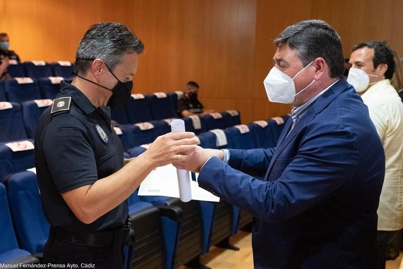 El alcalde de Cádiz, José María González, y la alcaldesa de Puerto Real, Elena Amaya, junto con los jefes de Policía Local de ambos municipios y el director de la Escuela Concertada, Superintendente, Juan M. Padilla, participaron en este acto en el que se entregaron diplomas a un total de 26 agentes de Rota, Puerto Real y Cádiz.