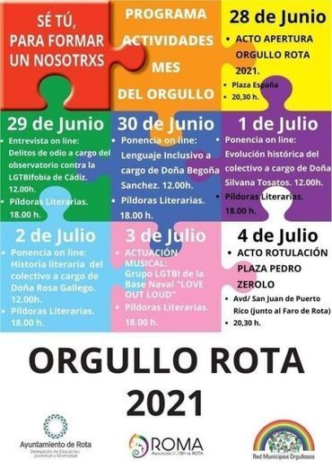 En esta programación se incluyen entre otras actividades, la exposición "NuesTrans Vidas Importan", que ha estado abierta desde el 1 de junio y cerrará este día 30, cedida por la Asociación Trans Andalucía (ATA) que se puede visitar en el Castillo de Luna y tiene como objetivo acercar experiencias reales desde la cotidianeidad de la vida de las personas trans y enviar un mensaje de esperanza a toda la juventud; la entrevista online sobre "Delitos de Odio", prevista para mañana a cargo del Observatorio contra la LGTBIfobia de Cádiz; píldoras literarias,  previstas para las seis de la tarde todos los días, del 29 de junio al 3 de julio; y la ponencia sobre lenguaje inclusivo que tendrá lugar el 30 de junio y será impartida por Begoña Sánchez Torrejón, profesora de la Universidad de Cádiz.