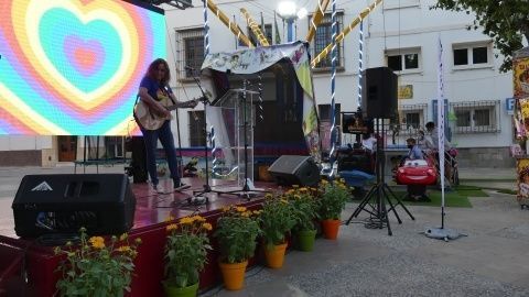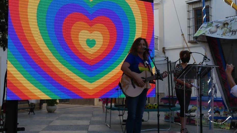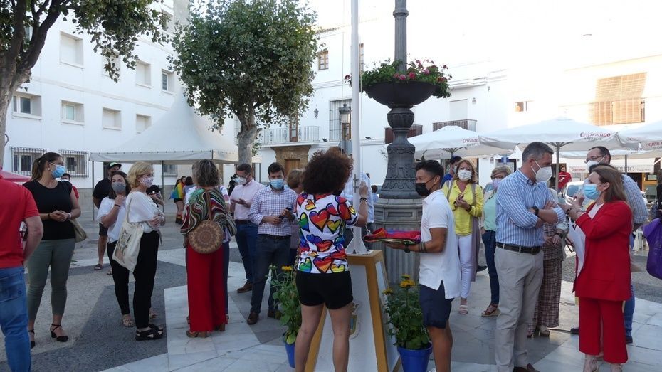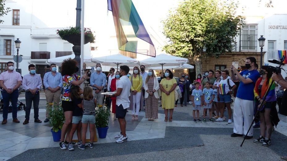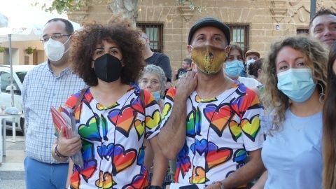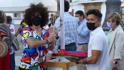 La izada de la bandera arcoíris, que ondeará en el centro de la plaza de España estos días, ha tenido como protagonistas a Sara Cortés, secretaria de la Asociación LGTBIQ+ ROMA, y a Ángel Bituin, del colectivo LGTBIQ+ de la Base Naval de Rota. Los dos jóvenes, han izado la insignia al son de los acordes que la cantautora Maite Menéndez ha ofrecido desde un escenario en el que se han escuchado de forma reiterada palabras como lucha, libertad, diversidad, tolerancia y amor.