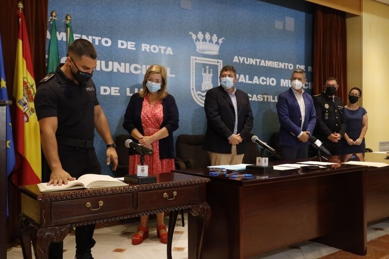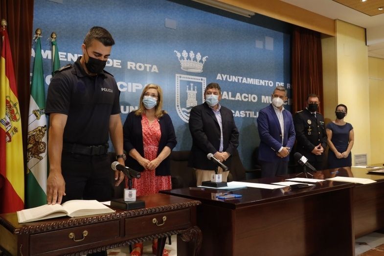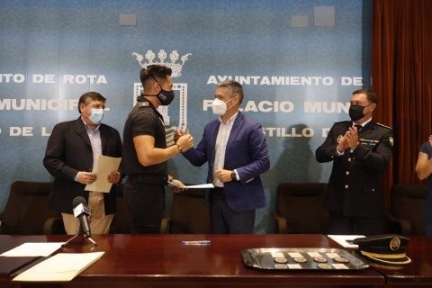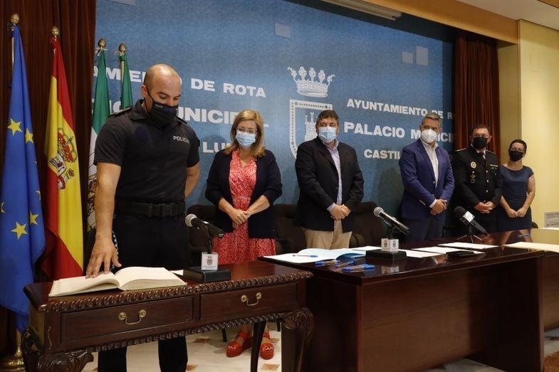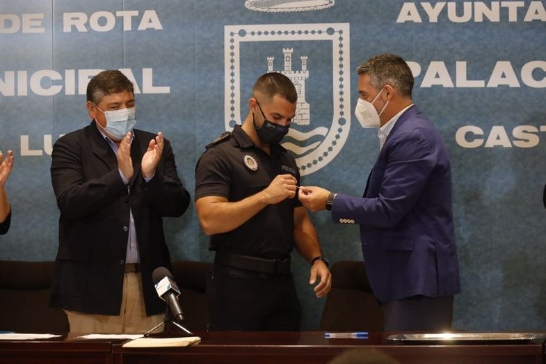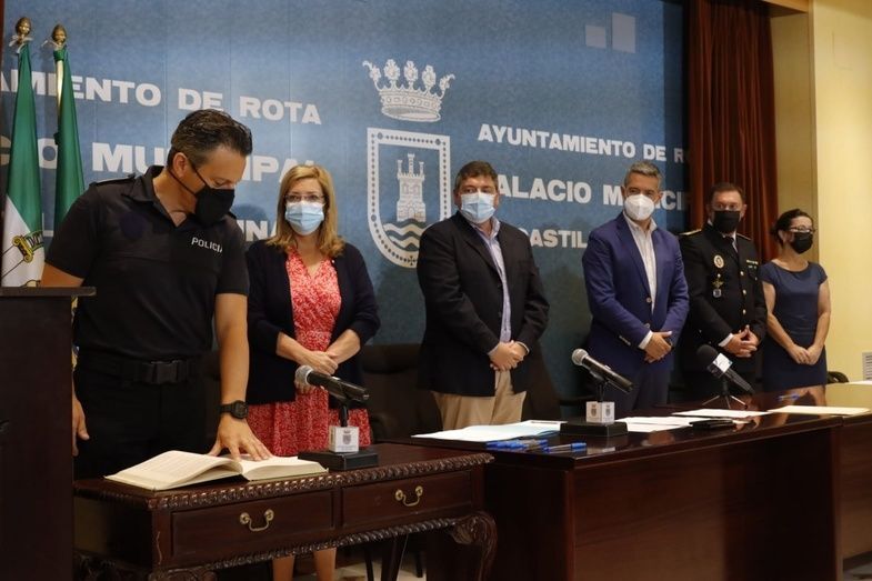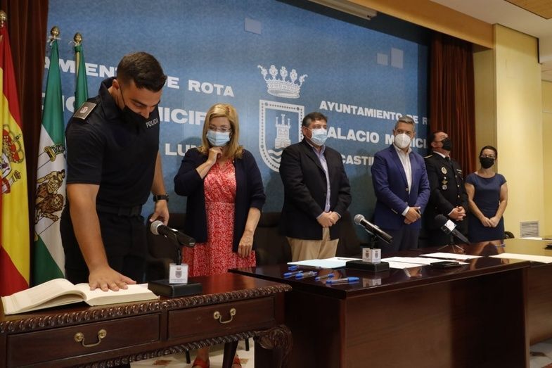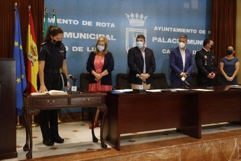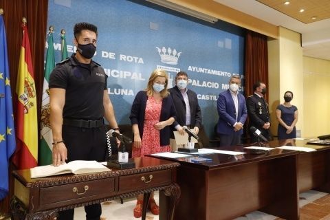 Tras las intervenciones, los siete policías locales tomaron posesión como funcionarios de carrera prometiendo o jurando el cargo, y recibiendo de manos del alcalde la placa de policía local de Rota.