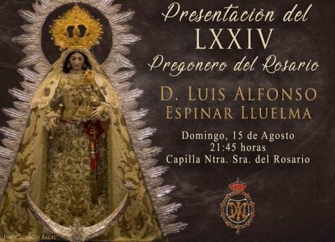 Por otro lado, la Hermandad del Rosario Coronada Rota celebrará desde el sábado 14 de agosto hasta el lunes 16 de agosto, una solemne ceremonia de veneración en honor de su titular, Nuestra Señora del Rosario Coronada. El horario de la misma será el de apertura de la Iglesia Parroquial. La hermandad de la Patrona ha comunicado que presentará oficialmente LXXIV Pregonero del Rosario, Luis Espinar Lluelma, y hacerle entrega de las pastas en las que guardará su pregón en un acto que se celebrará el domingo 15 de agosto a las 21:45.