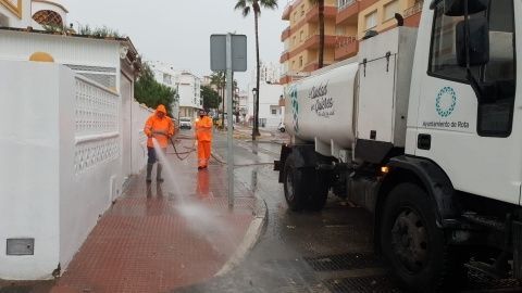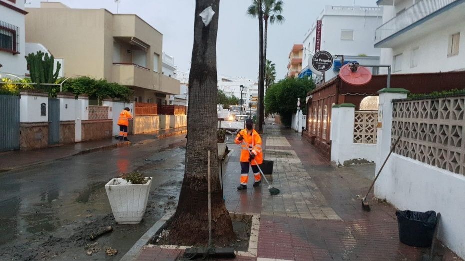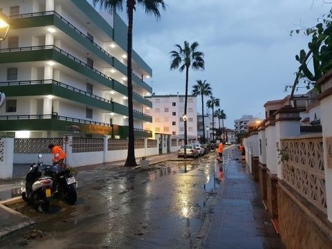 Desde las seis de la mañana, los operarios de los servicios municipales de limpieza, de la delegación que dirige Jesús López Verano, están trabajando de forma intensa para poder restablecer la normalidad en estas vías afectadas que estaban llenas de agua y con bastante suciedad.