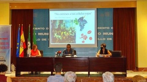 Rosa María Mateos Bernal, doctora en Biología Molecular y Bioquímica por la Universidad de Granada, fue muy cercana en sus explicaciones abordando en un tono divulgativo una patología cada vez más frecuente en niños de corta edad como la obesidad infantil. Apoyada en la proyección de varias pantallas a través de las que iba explicando esta enfermedad desde el punto de vista bioquímico, la ponente expuso la importancia de una buena alimentación para mantener el equilibro entre las células llamadas radicales y los antioxidantes. Básicamente, quiso explicar de forma sencilla, cómo funciona el cuerpo humano cuando se ingieren alimentos y en especial, el papel de las células rojas (glóbulos rojos) que son los que están en contacto con el plasma, donde van a parar todo a aquellos nutrientes que se ingieren y demás componentes de la sangre.