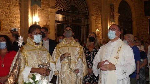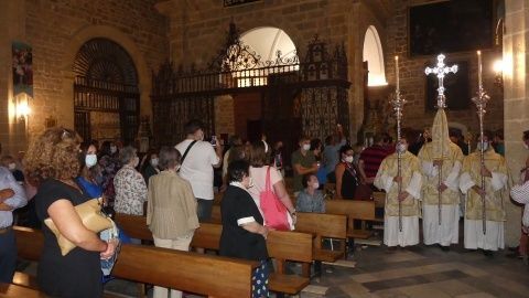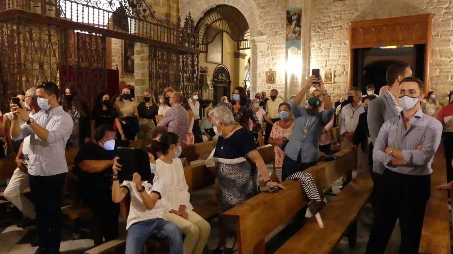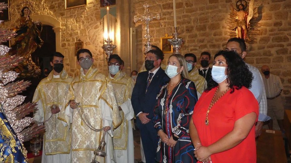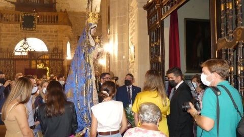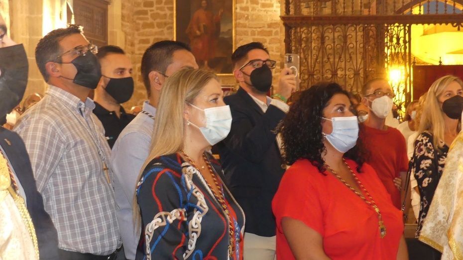 Tras la misa de las 8 de la tarde, la imagen de la patrona de Rota ha salido de su capilla portada por concejales del Ayuntamiento de Rota, concretamente del PSOE y del PP, ayudados por algún hermano de la Hermandad del Rosario que ha colaborado para que la talla de la virgen del Rosario llegara en su peana junto al altar desde el que ahora se ofician las eucaristías.