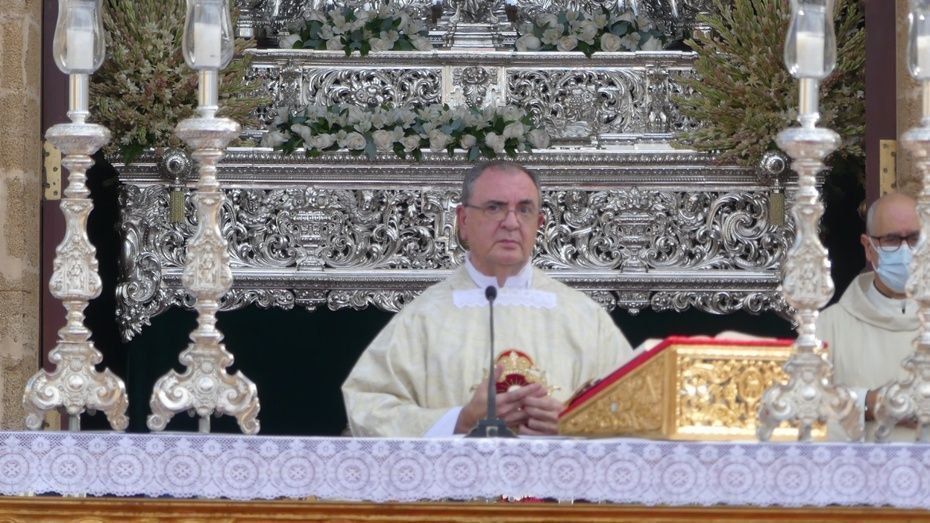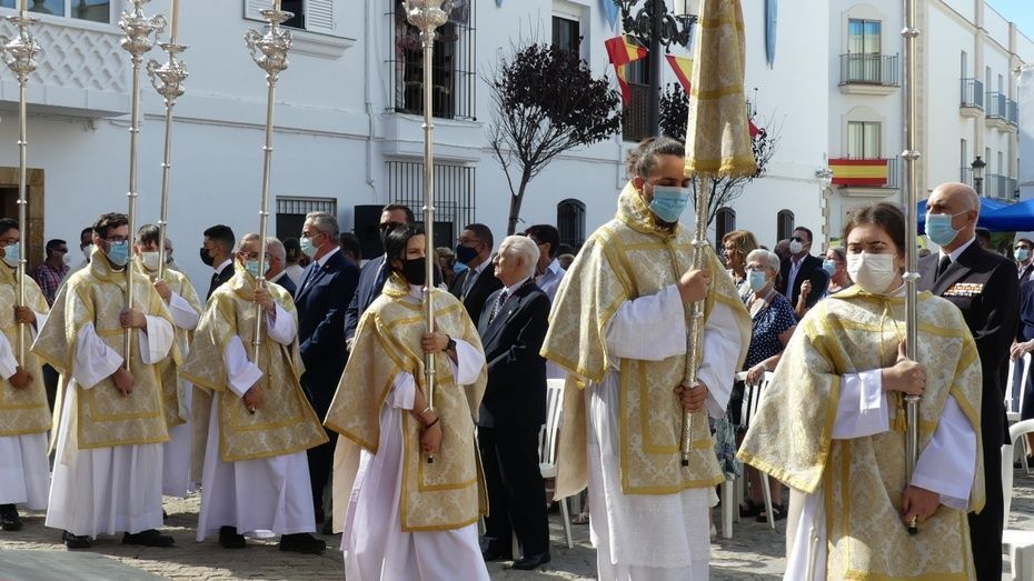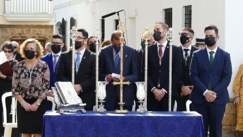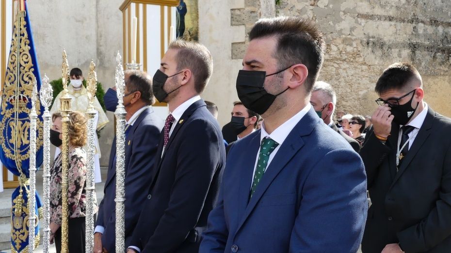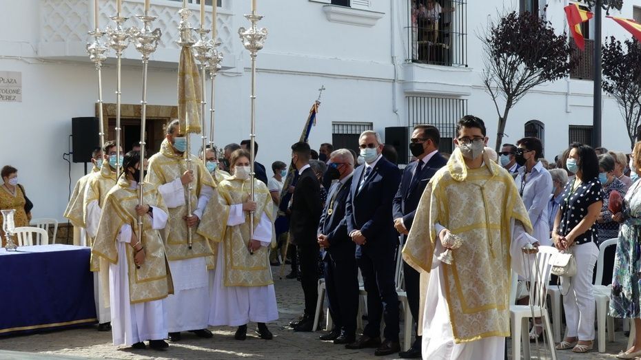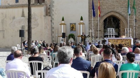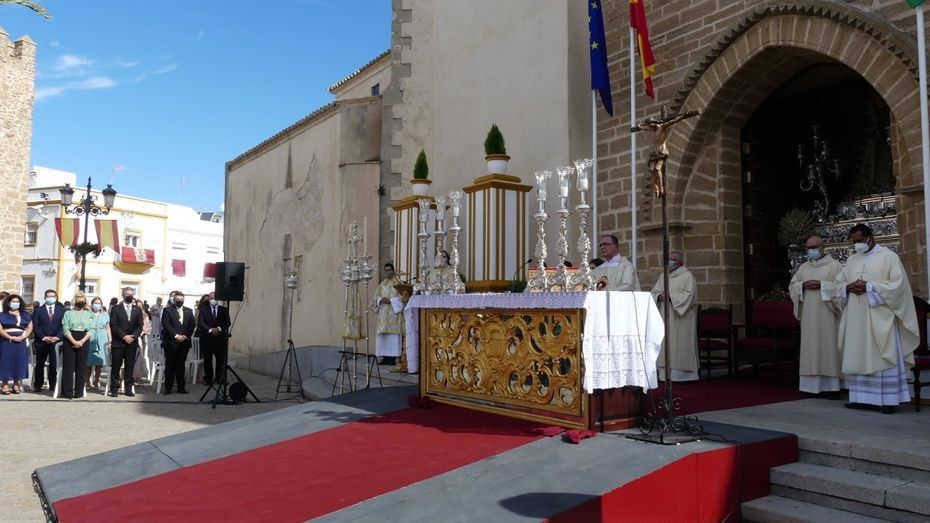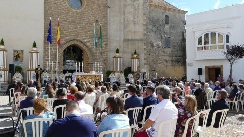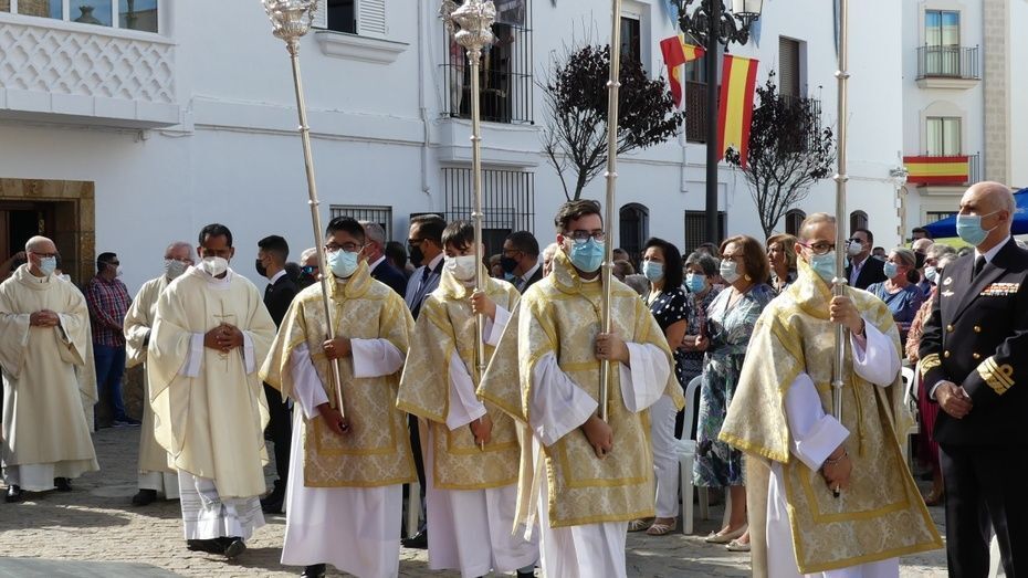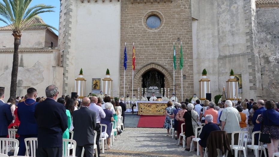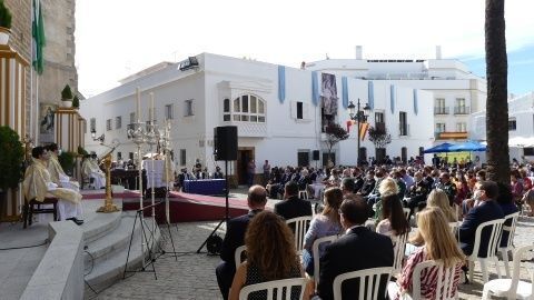 Como ya se hiciera el año pasado, la imagen de la virgen en su paso, preparada para su salida procesional de esta tarde, ha presidido esta misa solemne desde la puerta de la parroquia de Nuestra Señora de la O, donde en la plaza estaban fieles y devotos además de las 15 damas del Rosario, miembros de hermandades y una representación de las autoridades civiles y militares de la localidad, entre ellas, el alcalde de Rota, Javier Ruiz, junto a la Corporación municipal.