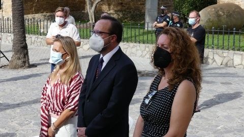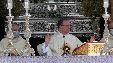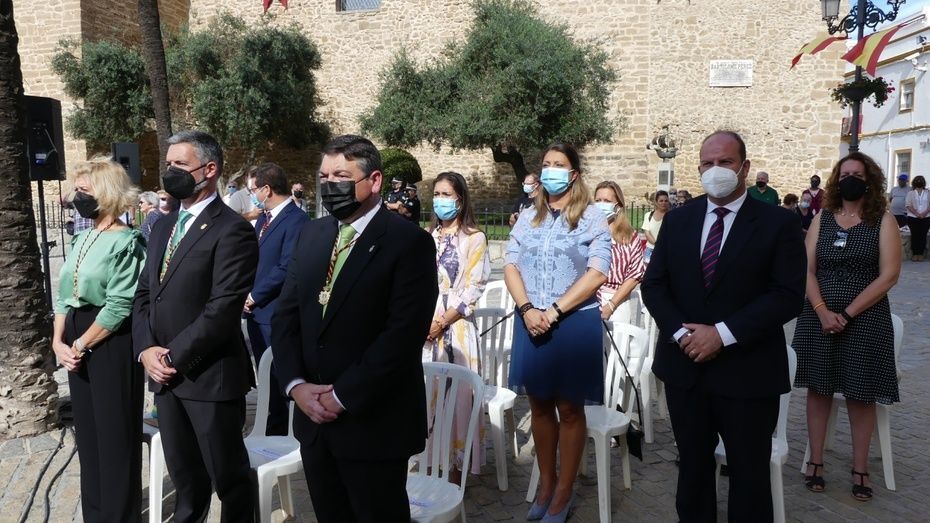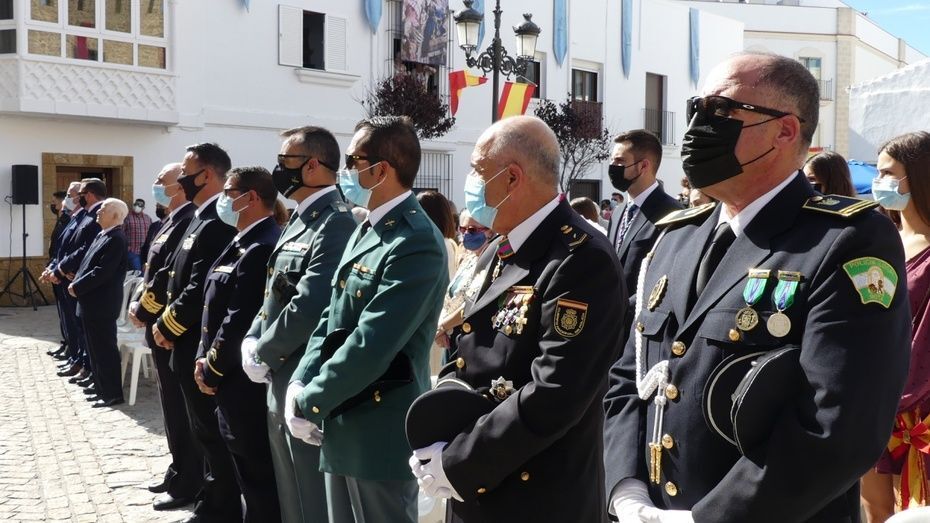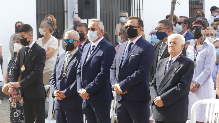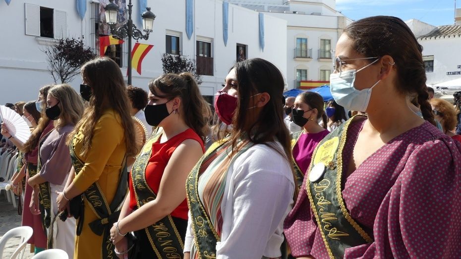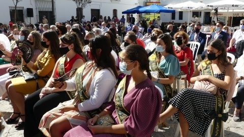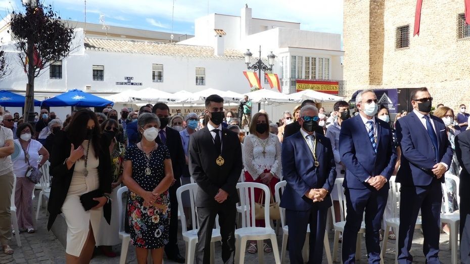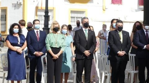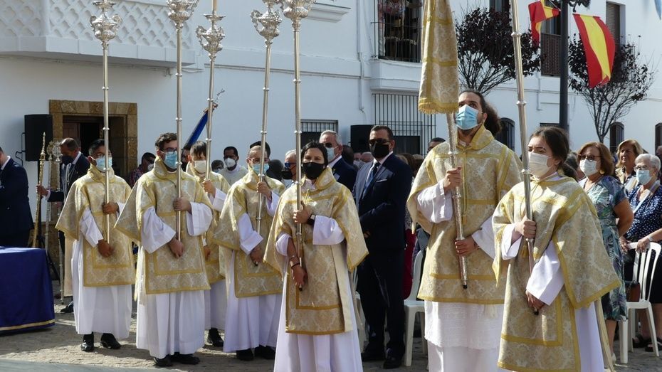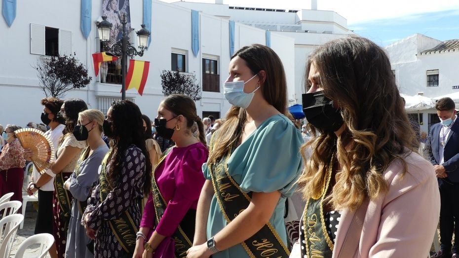 Como ya se hiciera el año pasado, la imagen de la virgen en su paso, preparada para su salida procesional de esta tarde, ha presidido esta misa solemne desde la puerta de la parroquia de Nuestra Señora de la O, donde en la plaza estaban fieles y devotos además de las 15 damas del Rosario, miembros de hermandades y una representación de las autoridades civiles y militares de la localidad, entre ellas, el alcalde de Rota, Javier Ruiz, junto a la Corporación municipal.