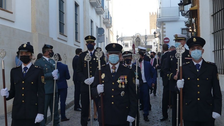 Dos parejas de la Guarda Civil escoltaban el paso de la virgen que para la ocasión ha lucido saya blanca bordada en oro, manto beige con bordados con el escudo antiguo de Rota, antes de que Nuestra Señora del Rosario fuera nombrada alcaldesa honoraria de la villa, y ha estrenado el encaje del pecherín, un encaje francés de plata del siglo XIX y la toca de encaje antiguo de malla de oro. Su corona de oro del día de la coronación y muchas joyas donadas a lo largo de estos años por fieles y devotos, han complementado la imagen de la patrona que ha recorrido cada rincón de Rota esperada por muchos roteños, guiada por el capataz Pablo Barba y su grupo.