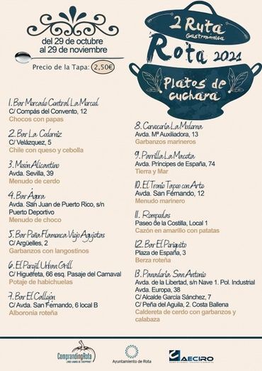 [Img #154490]Desde este viernes, 29 de octubre, al 29 de noviembre, los roteños podrán disfrutar de guisos tradicionales de cuchara propios del otoño gracias a la apuesta de 13 bares de Rota que se han sumado a la II Ruta Gastronómica de Platos de Cuchara que impulsa las delegaciones de Promoción Turística y Comercio, con la colaboración de Aeciro.
