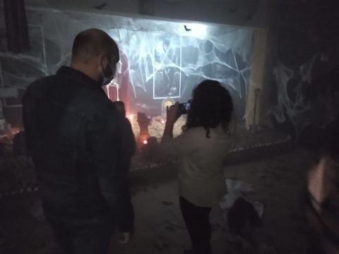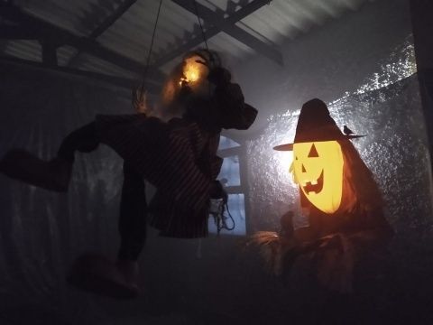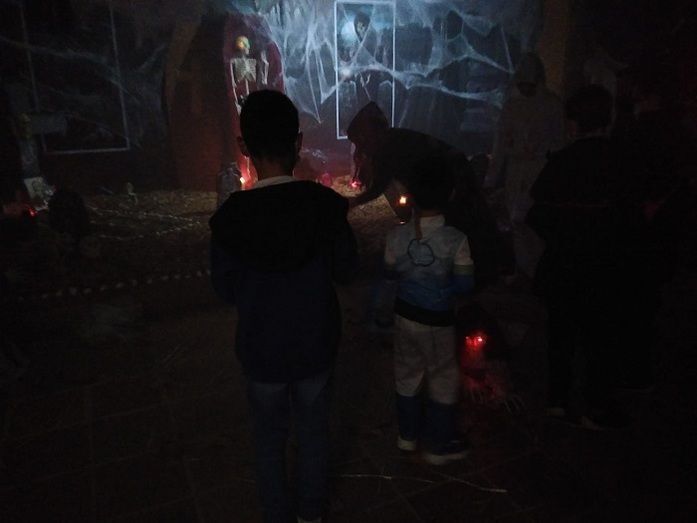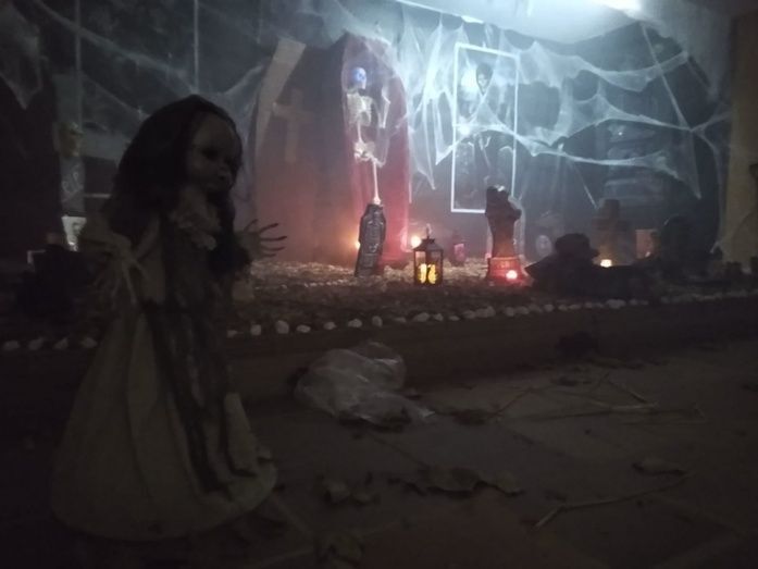 Desde primera hora de la tarde, se han ido acercando muchos ciudadanos para disfrutar de una decoración muy cuidada en la que no han faltado los típicos atributos terroríficos como esqueletos, tumbas, brujas, calabazas, cuchillos ensangrentados, telas de araña y mucha oscuridad, lo que ha dado un aire tenebroso a un espacio por el que han pasado una gran cantidad de niños y adultos.