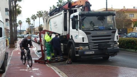El camión de recogida de basura se lleva por delante seis coches y una moto que estaban aparcados