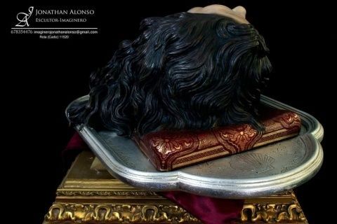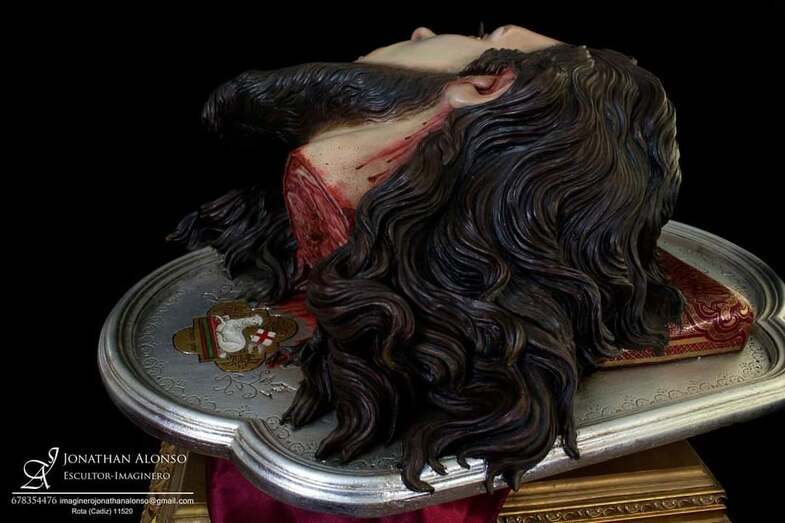 El escultor e imaginero roteño, Jonathan Alonso Niño, ha presentado su nueva obra que tendrá destino Chicago (Illinois, EEUU) donde participará en una serie de proyectos expositivos durante el año 2022. Se trata de una representación iconográfica del martirio de San Juan Bautista narrado en los evangelios que relata la muerte por decapitación a cargo de Herodes Antipas, ya que su hija Salomé aconsejada por su madre Herodias, pidió la cabeza de Juan Bautista, la cual le fue entregada en una bandeja de plata.