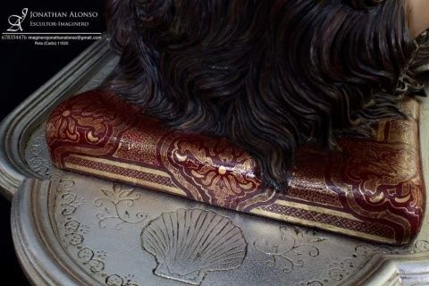 La imagen en la que el artista roteño ha trabajado, está realizada en barro cocido y policromado al óleo, con postizos de pelo natural en las pestañas superiores y dientes protésicos. El cojín se encuentra dorado con pan de oro y estofado al temple a huevo. La bandeja es de madera plateada con pan de plata y la pintura de la cartela inferior, al óleo sobre pan de oro.