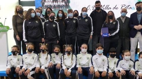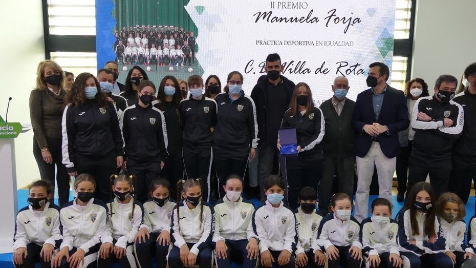 Terminaba la entrega de premios con las roteñas del club deportivo de Fútbol Sala Femenino "Villa de Rota", entidad deportiva de la localidad anfitriona que lucha por inculcar el valor del deporte en las niñas y jóvenes, visibilizando su presencia en un deporte que busca tener su propio hueco desde la perspectiva femenina. Fátima García recogía el premio en nombre de su otra compañera, Cristina, del cuerpo técnico y de las jugadoras, a las que subió también el escenario. El CD FSF "Villa de Rota" ha conseguido varios títulos de campeones en distintas categorías a nivel andaluz y provincial y algunas de sus jugadoras han sido fichadas por la selección gaditana y andaluza para competiciones de mayor nivel. El esfuerzo que hacen por inculcar valores de deportividad, respeto, amistad, esfuerzo y trabajo, le han hecho merecedor de un galardón que Fátima agradecía reconociendo que son una minoría en el fútbol que pelea por mayor visibilidad. Especialmente, compartió el reconocimiento con las chicas a las que entrena, con las familias y con todos los que colaboran con el club para ayudarles a seguir esta andadura hacia un mundo más equitativo, incluidos los hombres.