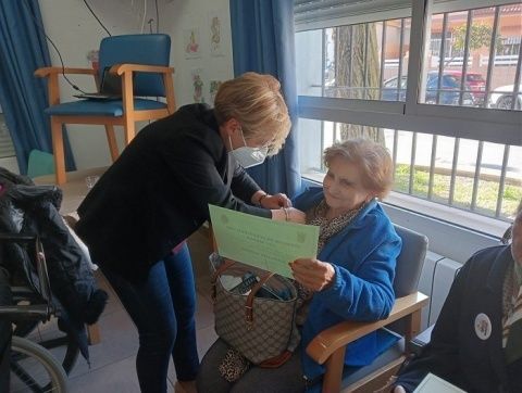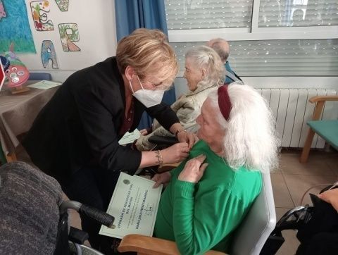 Concluida la sesión, Luisa Fernández entregó a todos y cada uno de los abuelos un diploma y un pin en agradecimiento por su participación en esta actividad que se suma a las propuestas que a diario se llevan a cabo en la residencia buscando el bienestar de los mayores.
