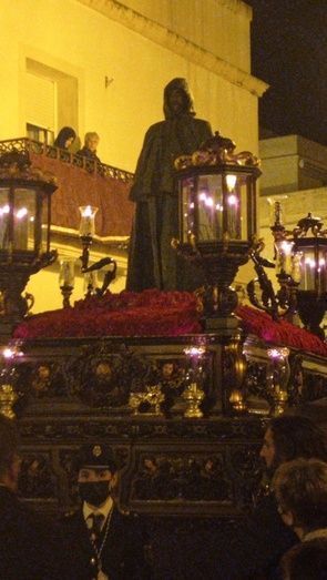 El cortejo, para mayor agilidad, se ha dispuesto en filas de cuatro en cuatro hermanos que junto al estandarte de la hermandad, han precedido a Jesús Cautivo que a las 23.41 horas se dejaba ver con un chubasquero protector para cubrirse por si la lluvia de repente, hiciera de nuevo acto de presencia y sorprendiera a mitad del camino.