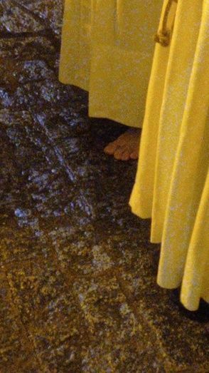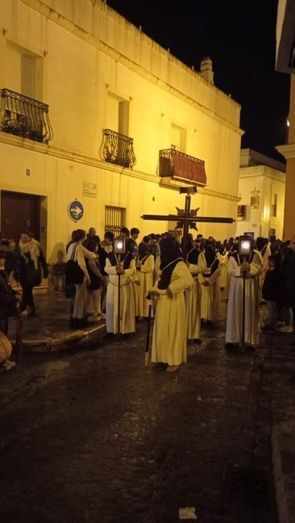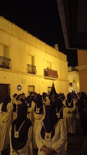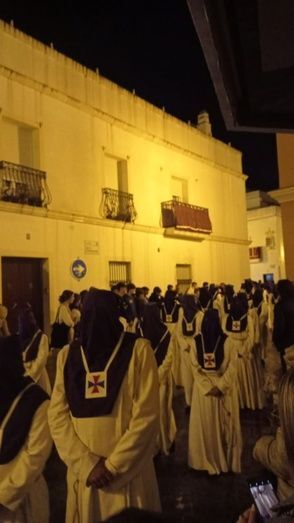 A las 23.30 horas, los primeros hermanos vestidos de penitentes han salido por el arco de la puerta de la iglesia y con una plaza Bartolomé Pérez mucho menos concurrida de lo que lo estaba a la hora inicial de su salida, han ido desfilando, sin insignias, sin cirios, ni cruces.
