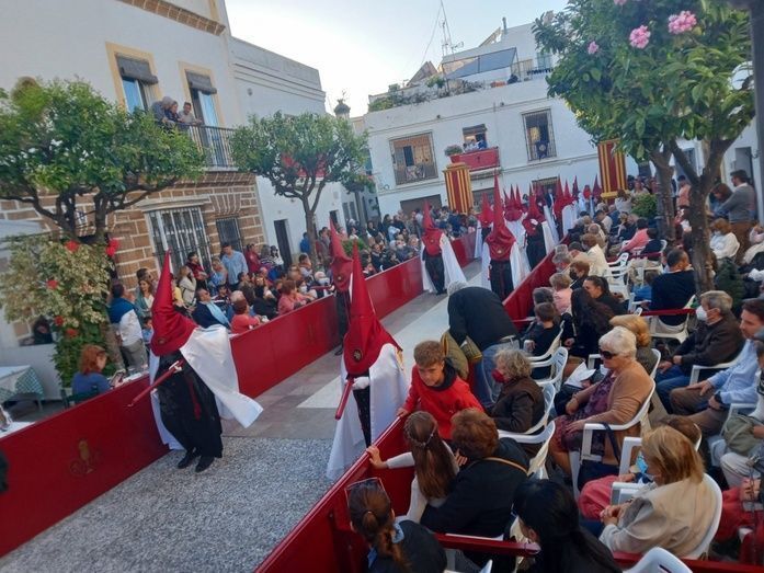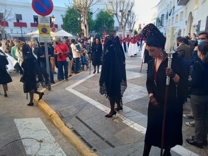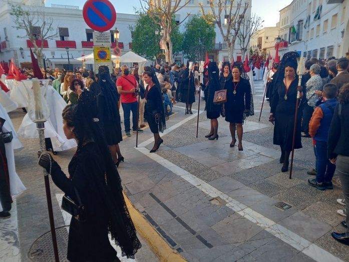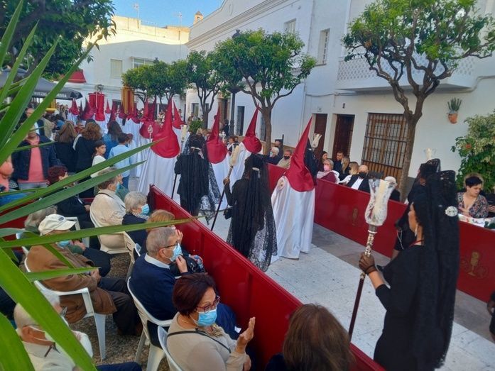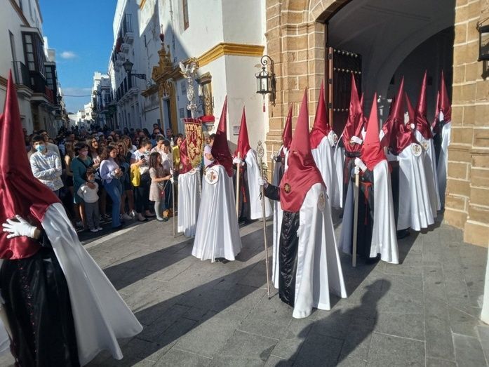 Tras vivir momentos de emoción en el interior de la capilla, las puertas de la Caridad se abrían a las siete de la tarde para dejar pasar a la Cruz de Guía y tras ella, el cortejo de hermanos penitentes portando cirios y algunos de ellos, las insignias más destacadas de la hermandad, una de las que mejor patrimonio cofradiero posee en Rota.