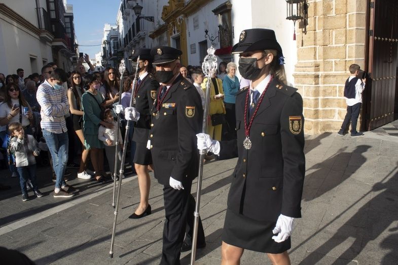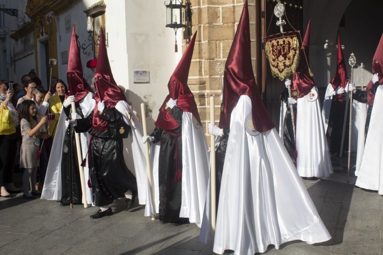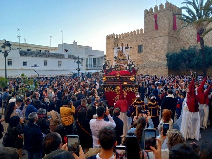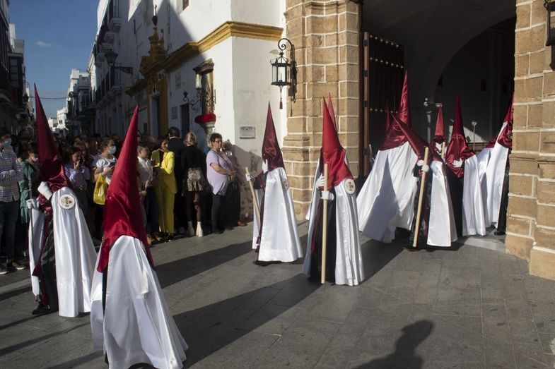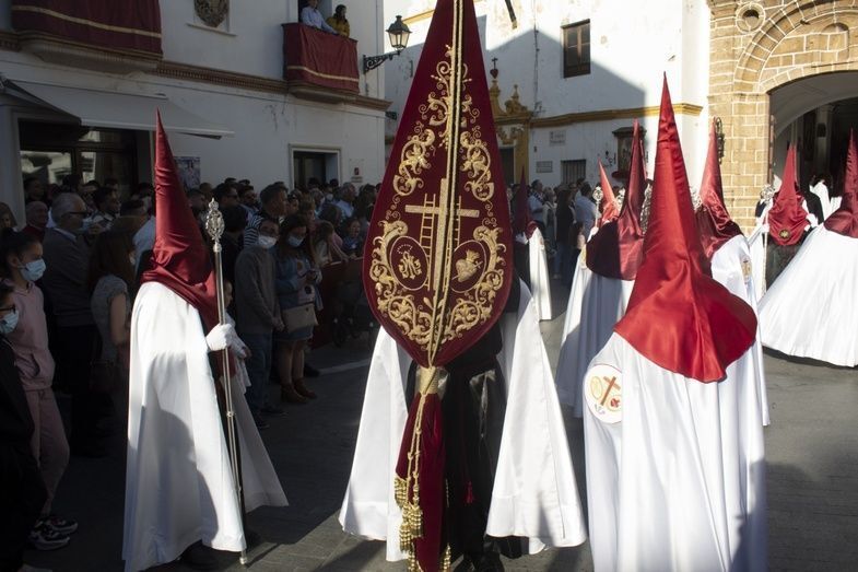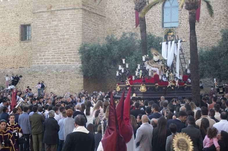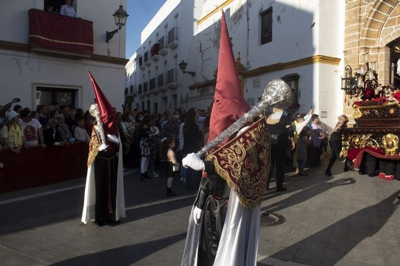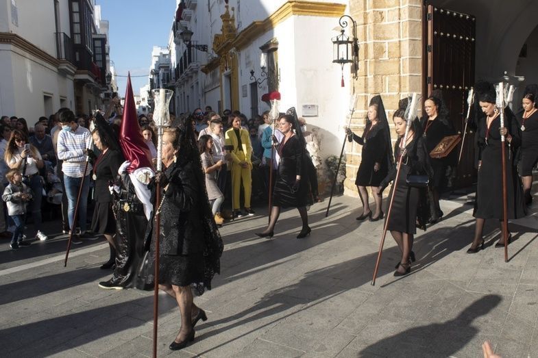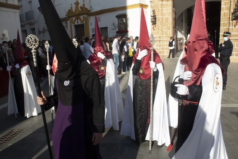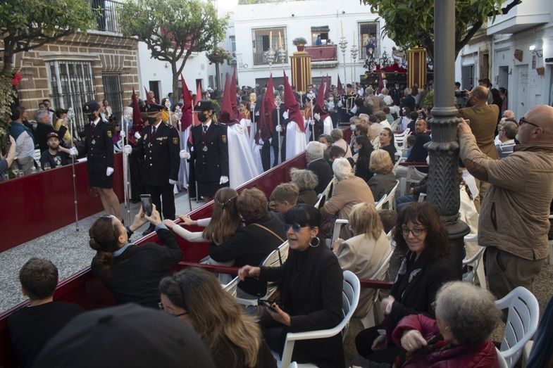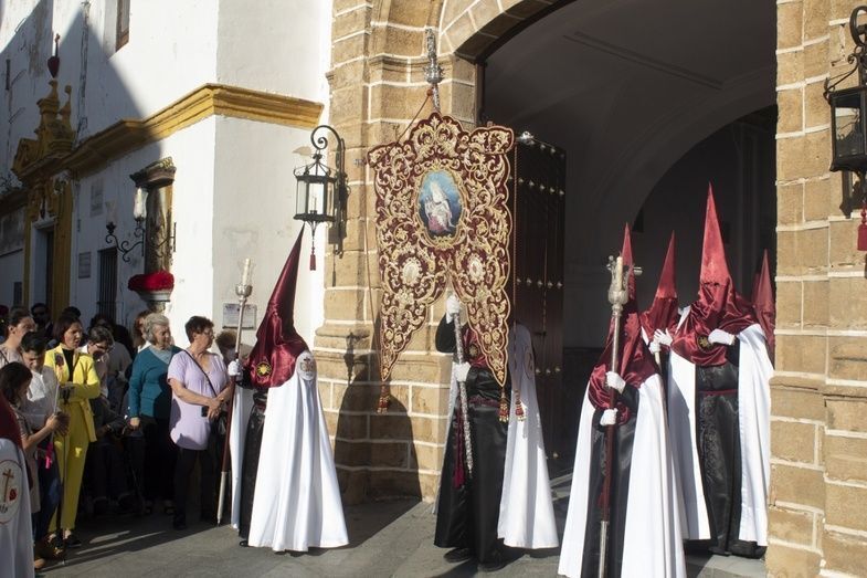 La jornada del Jueves Santo, de gran devoción en la villa de Rota, fue plena desde el momento de su salida con un ambiente por las calles que ya hacía presagiar que Nuestra Señora de los Dolores y el Santísimo Cristo de la Caridad no iban a estar solos en ningún momento de su estación de penitencia. Una salida procesional que se ha podido completar gracias a unas condiciones meteorológicas que han acompañado todo el día.