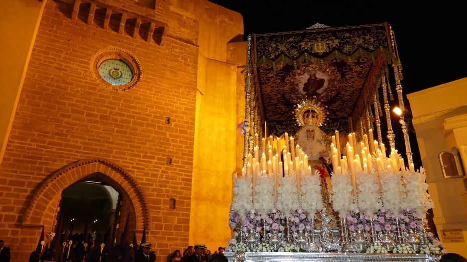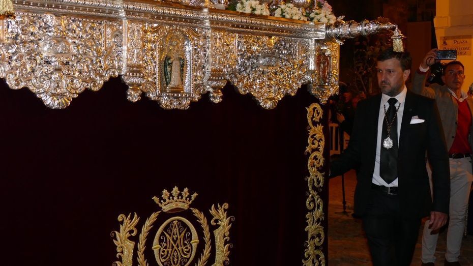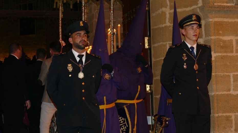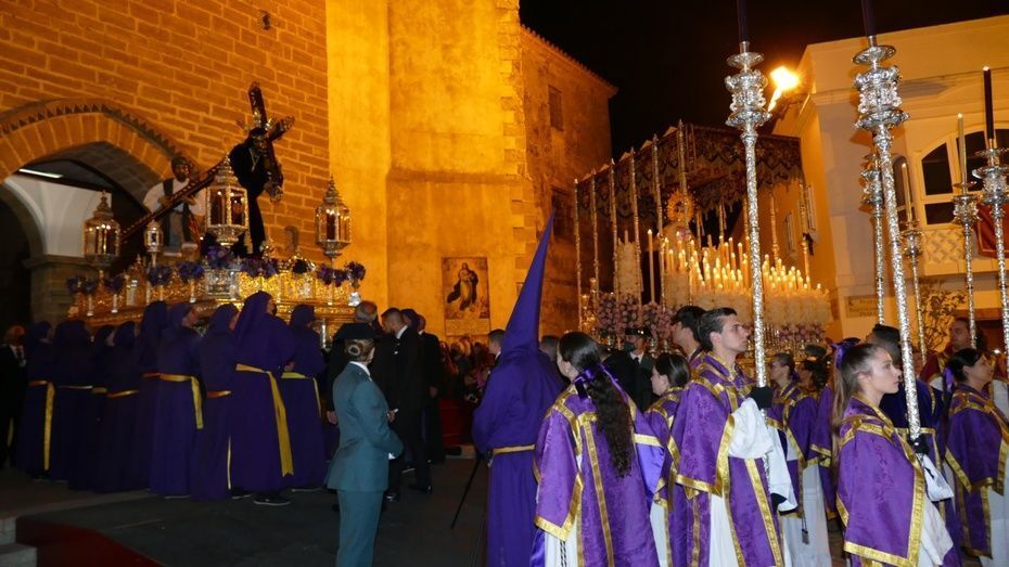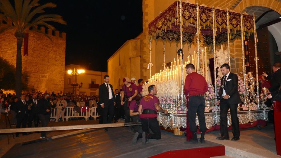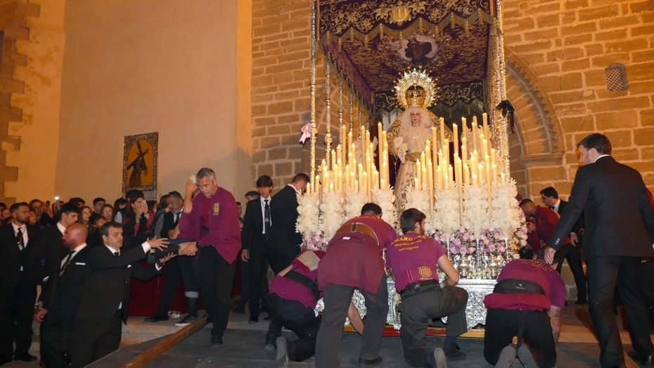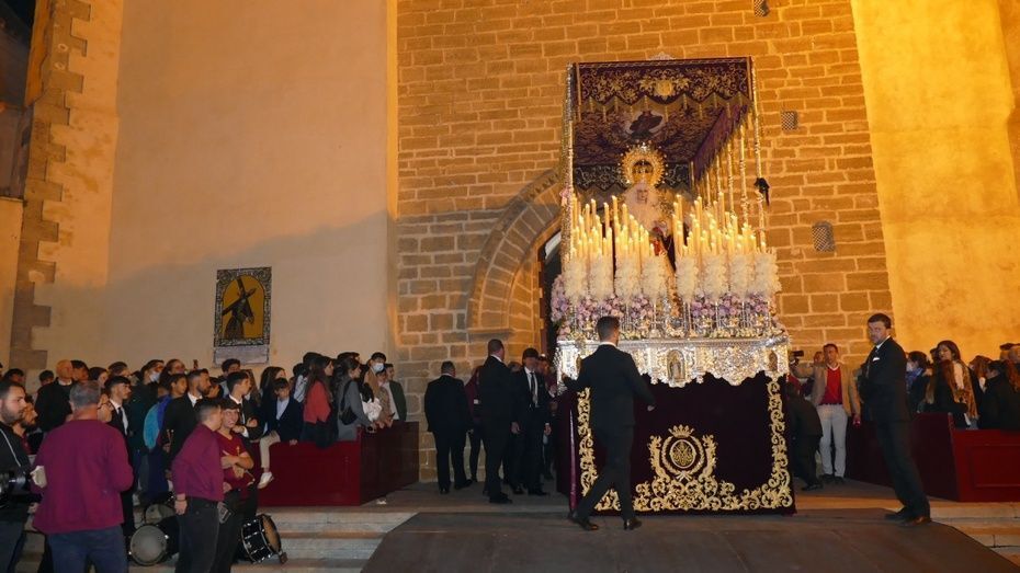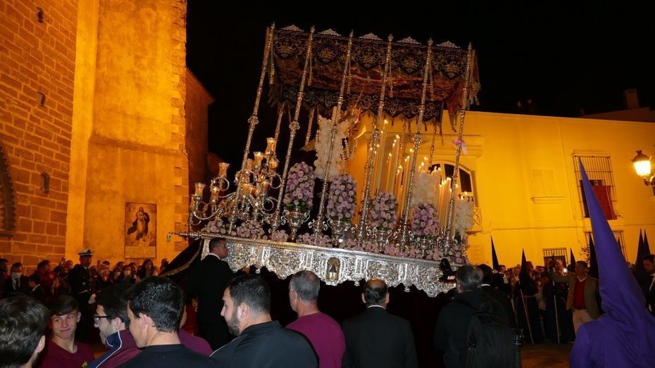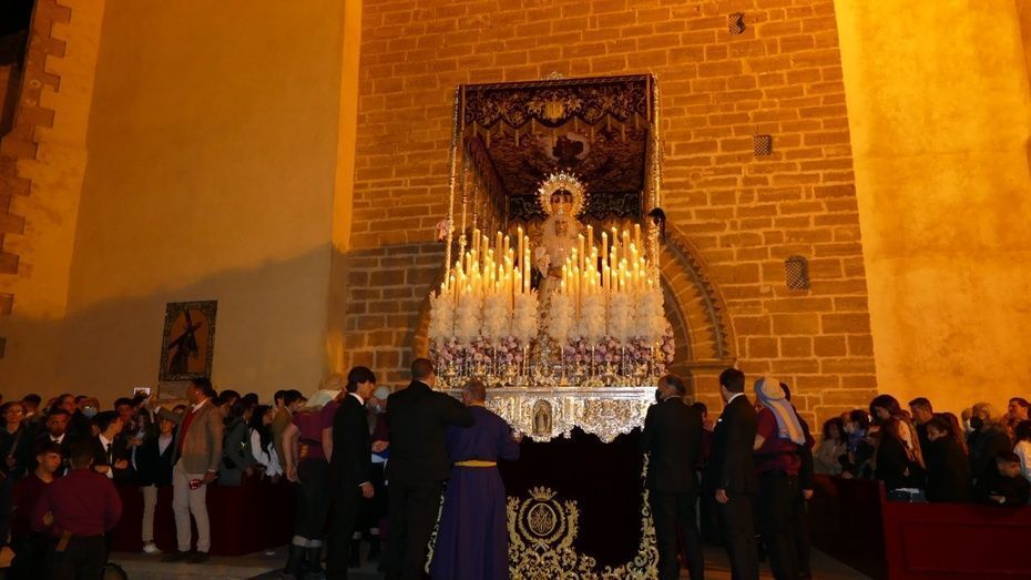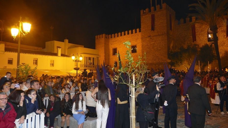 La plaza Bartolomé Pérez estaba llena de público minutos antes de que se abrieran las puertas de la iglesia de Nuestra Señora de la O para empezar a dejar pasar a una representación de hermanos penitentes que con las insignias más destacadas, han formado parte del cortejo, esperando a ver salir en primer lugar, a la virgen de la Amargura que se colocaba a un lado de la puerta principal. Mientras los costaleros hacían las maniobras propias de la salida y montaban el paso a las órdenes del capataz Pablo Barba, los roteños esperaban impacientes ver aparecer al Señor de Rota que lo ha hecho sobre las 2.25 horas situándose, siguiendo las órdenes del capataz Diego Mateos Laynez, al lado del paso de palio. Sonaban de fondo los palillos en la caja china y con ello, un sonido que es muy característico de este inicio de la Madrugá roteña.