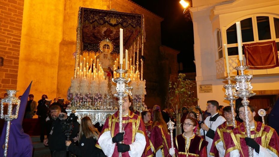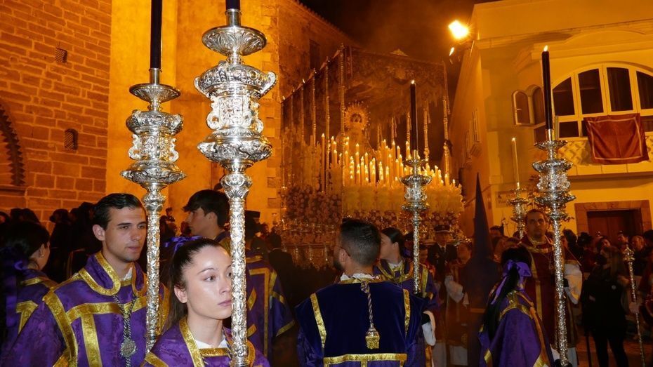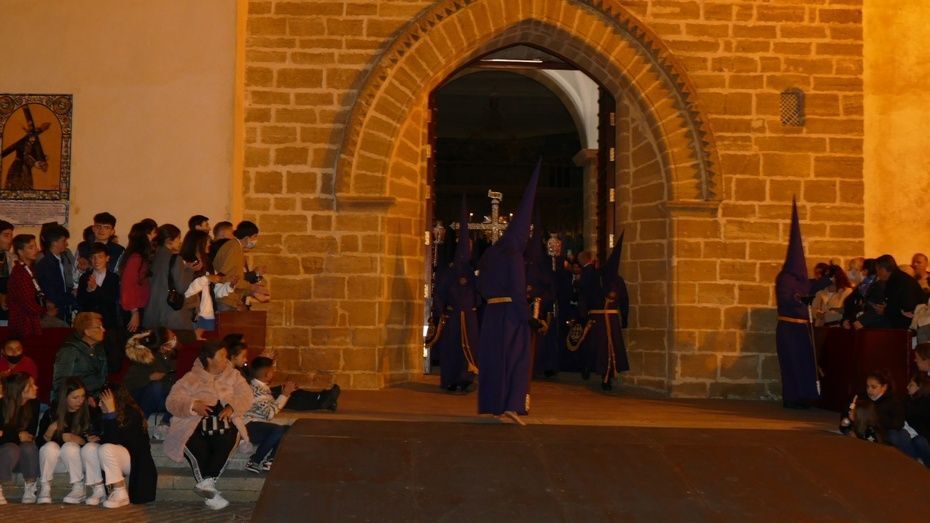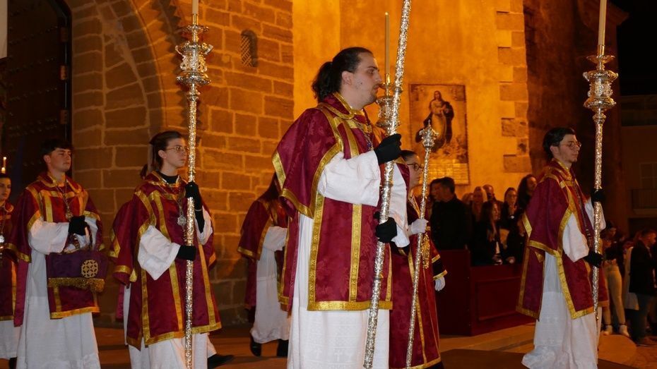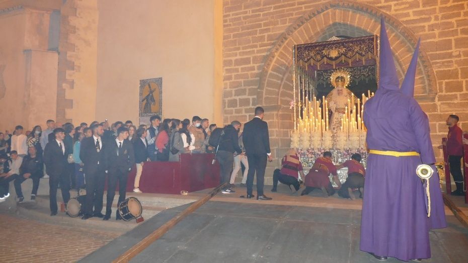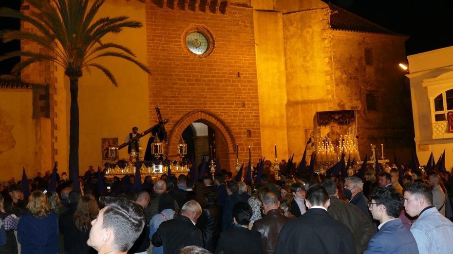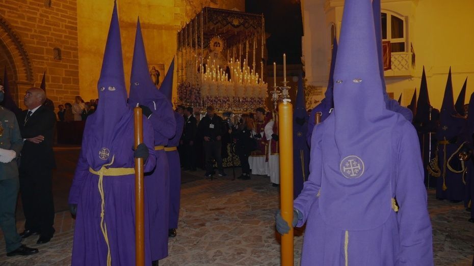 Tras los 20 minutos aproximadamente que ha durado el Sermón de Pasión, que es una tradición que se da en muchos pueblos de Andalucía, y que en Rota, aunque con modificaciones en los últimos años, se mantiene desde hace mucho, comenzaba a marchar el cortejo sobre las tres de la madrugada, ya con los nazarenos de cirio tomando su lugar y enfilando una plaza Bartolomé Pérez menos concurrida que a la hora de la salida.