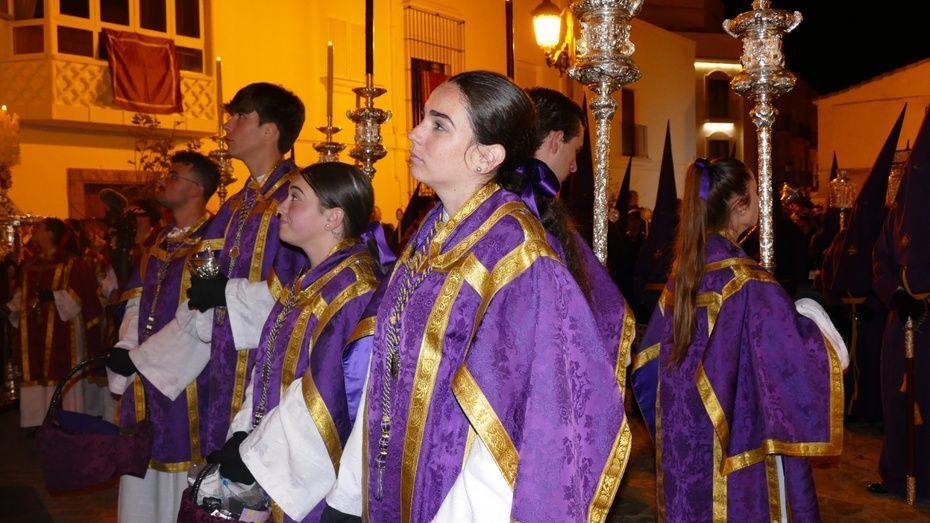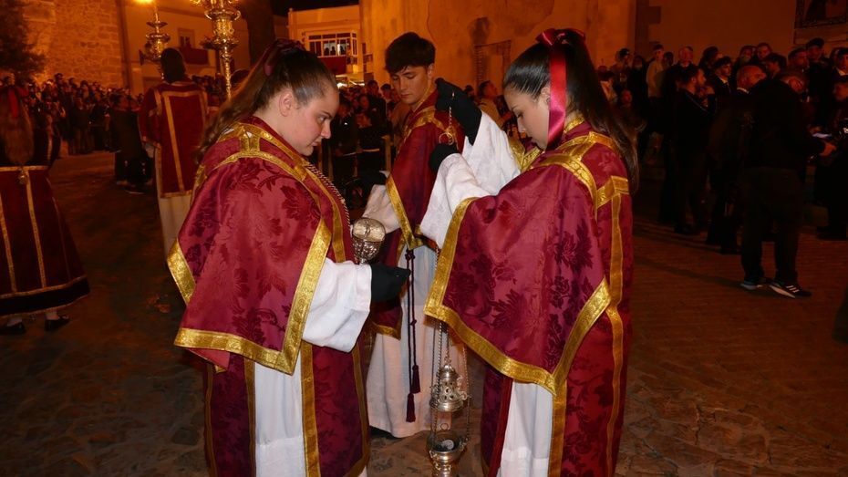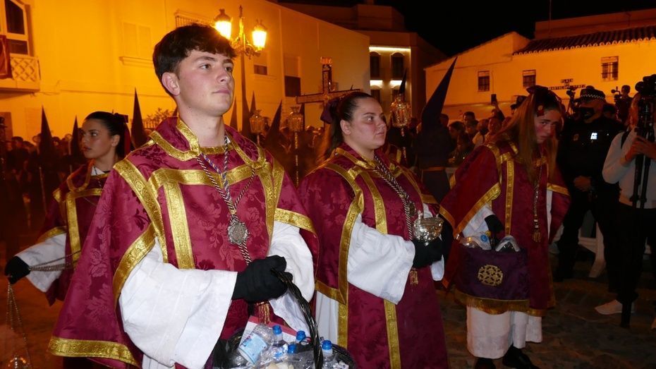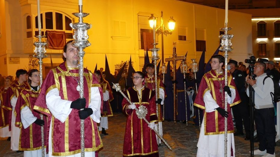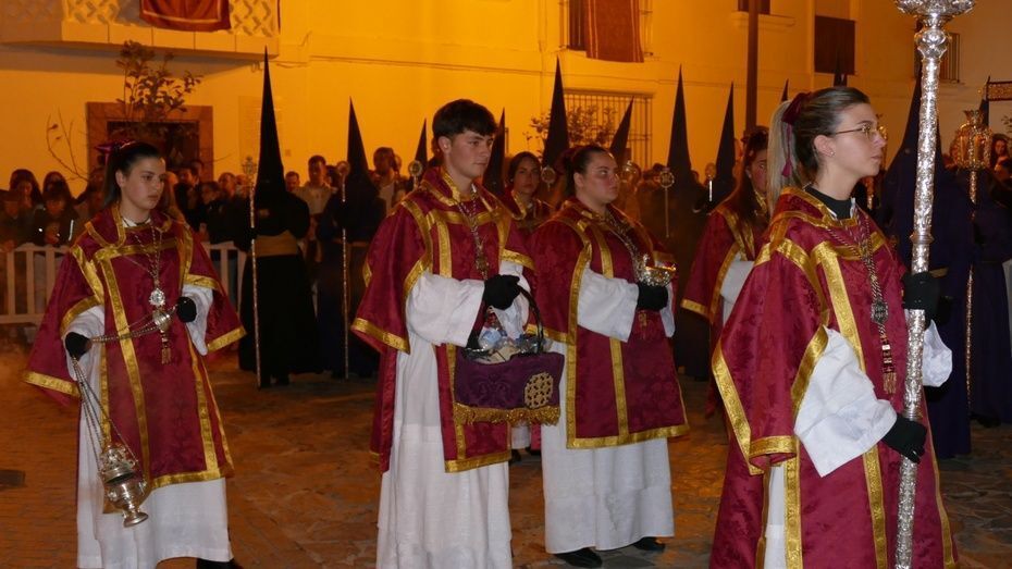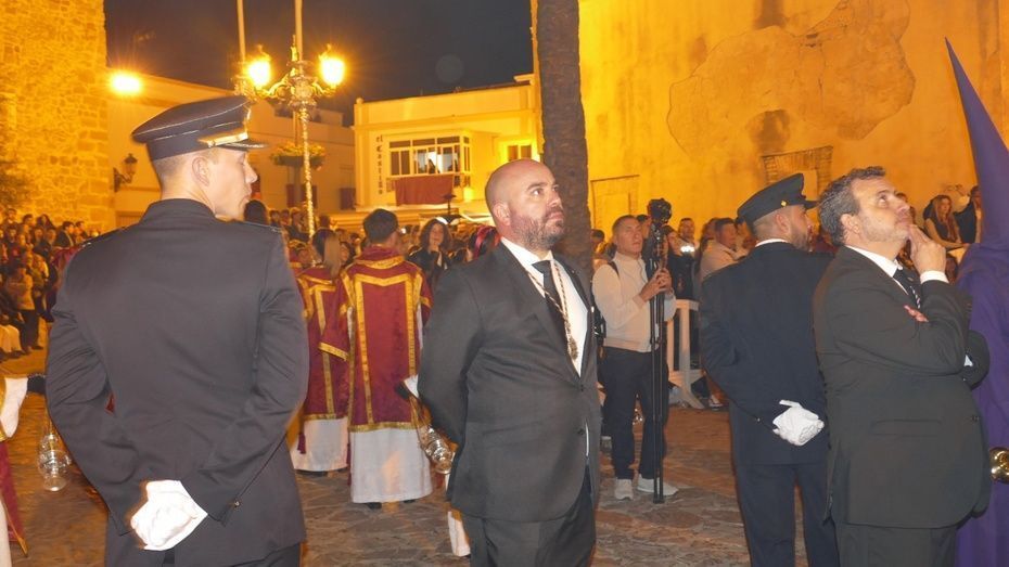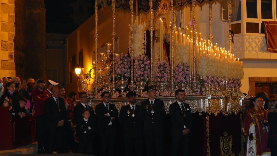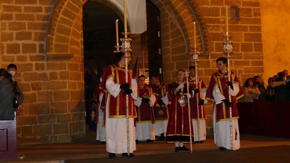 Tras los 20 minutos aproximadamente que ha durado el Sermón de Pasión, que es una tradición que se da en muchos pueblos de Andalucía, y que en Rota, aunque con modificaciones en los últimos años, se mantiene desde hace mucho, comenzaba a marchar el cortejo sobre las tres de la madrugada, ya con los nazarenos de cirio tomando su lugar y enfilando una plaza Bartolomé Pérez menos concurrida que a la hora de la salida.