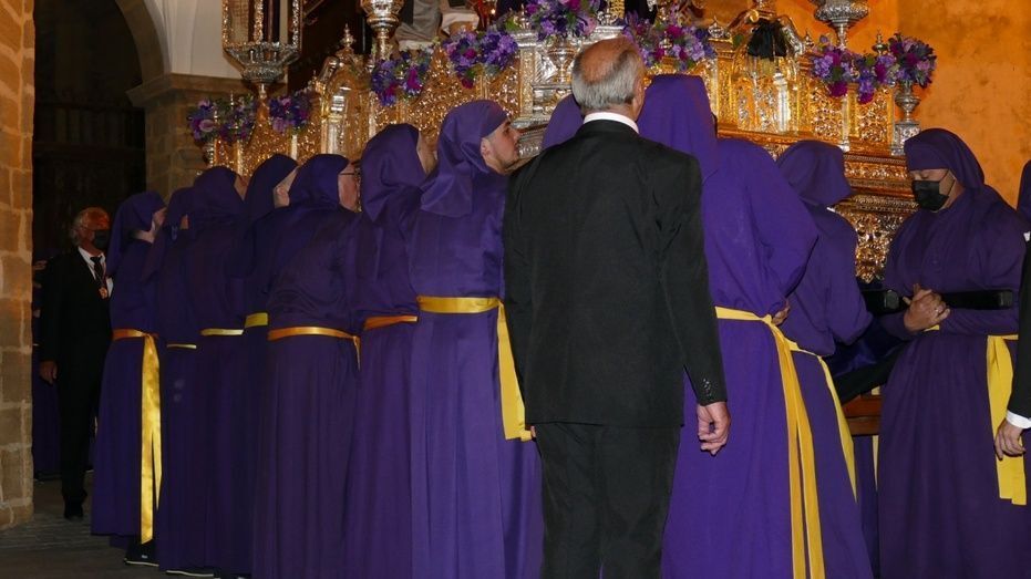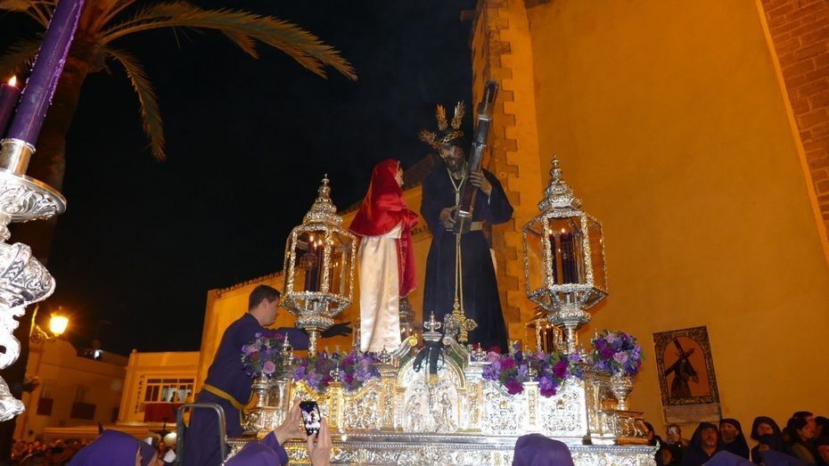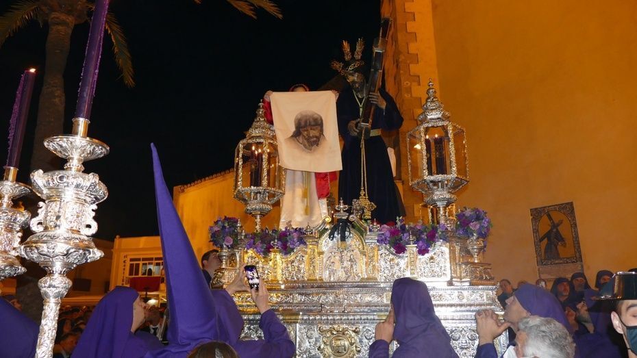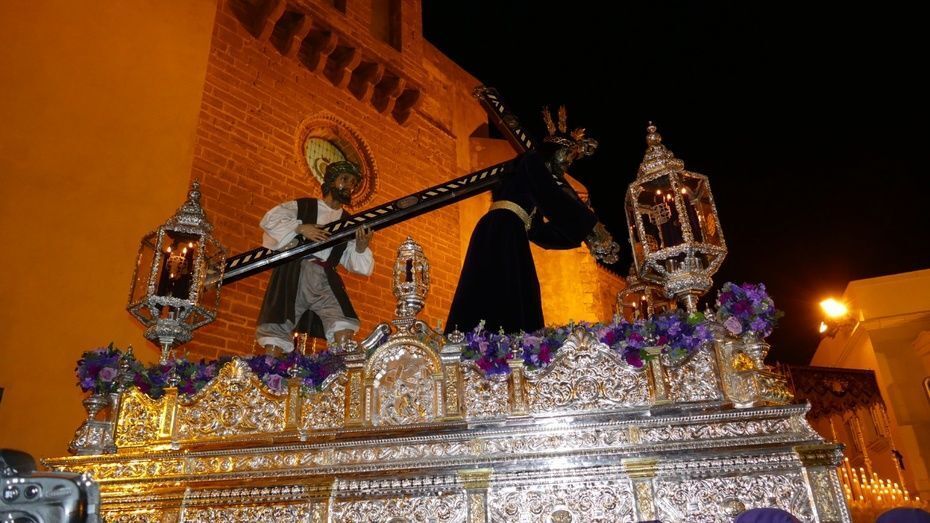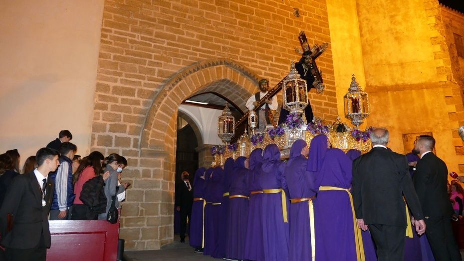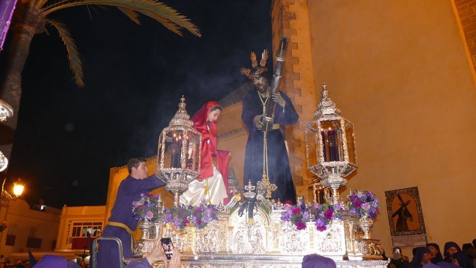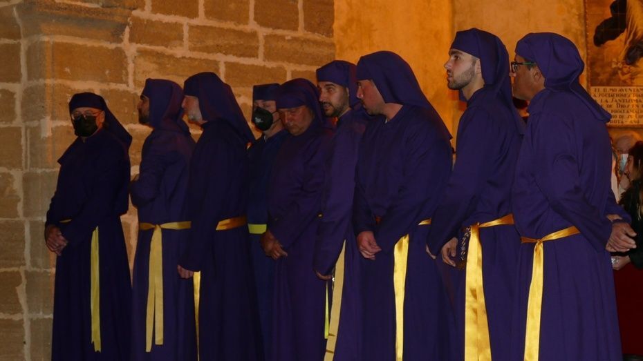 El Señor de Rota ya está en la calle y estrena para esta noche su túnica morada de terciopelo; también lo hace el Cirineo que le ayuda a cargar la cruz, que estrena las ropas, distintas a la túnica habitual que solía lucir.