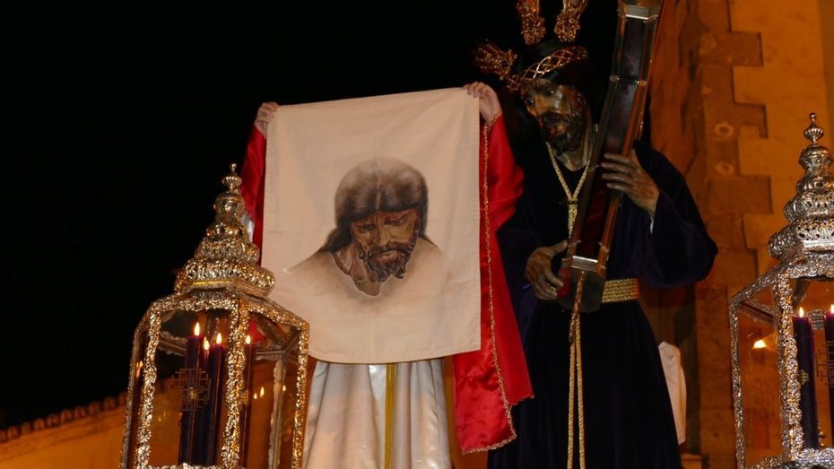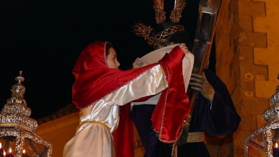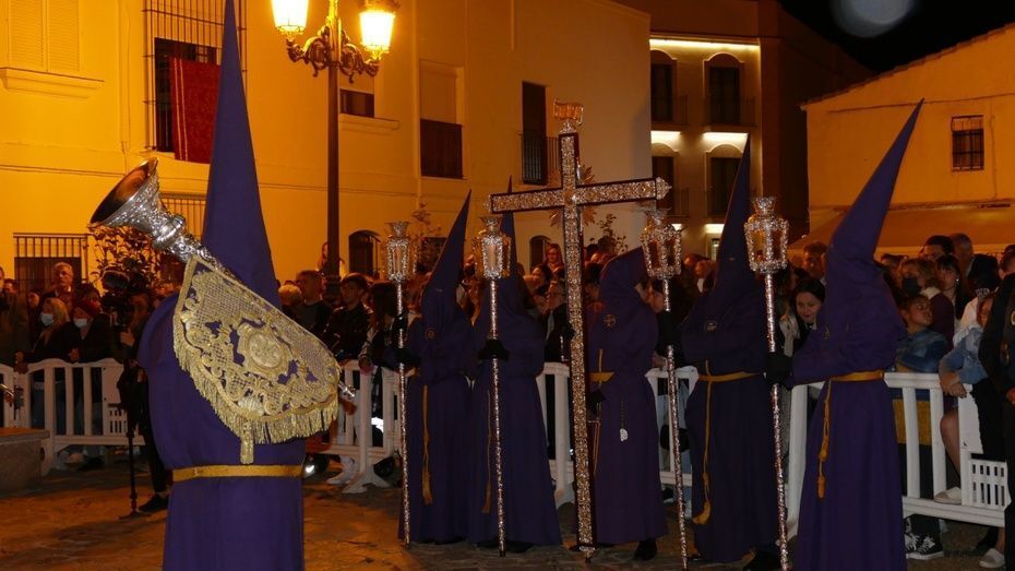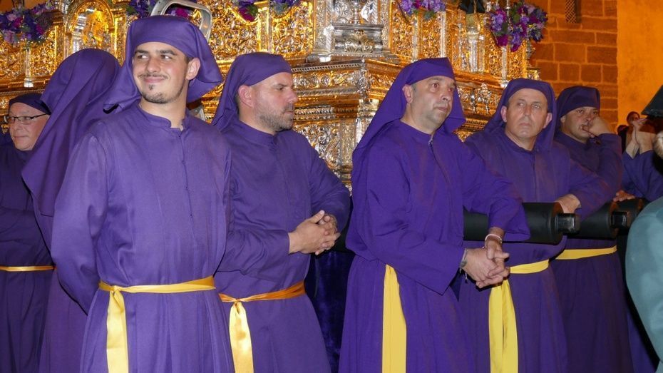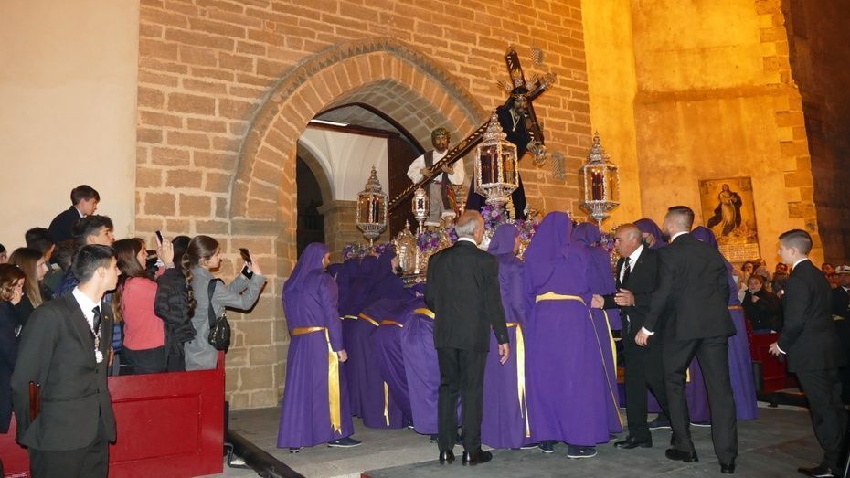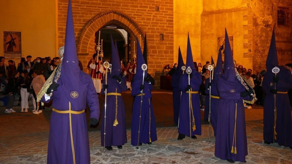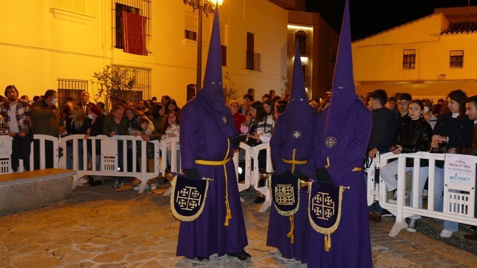El Señor de Rota ya está en la calle y estrena para esta noche su túnica morada de terciopelo; también lo hace el Cirineo que le ayuda a cargar la cruz, que estrena las ropas, distintas a la túnica habitual que solía lucir.