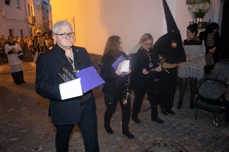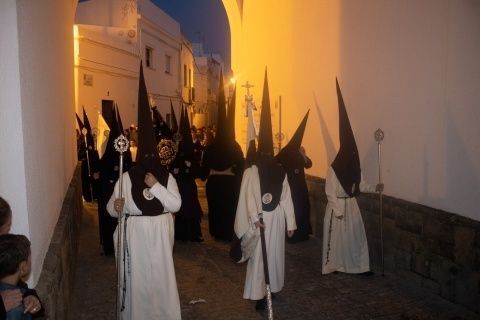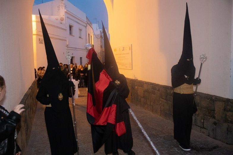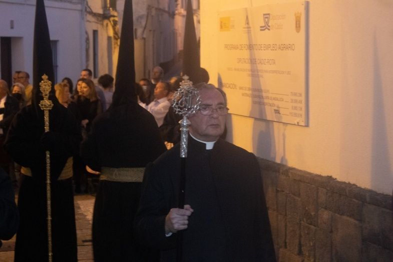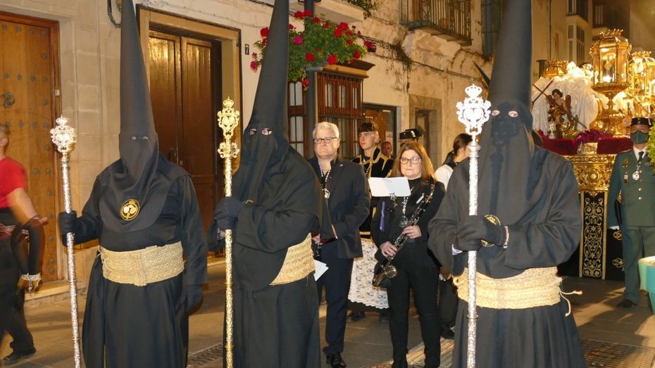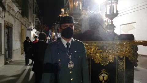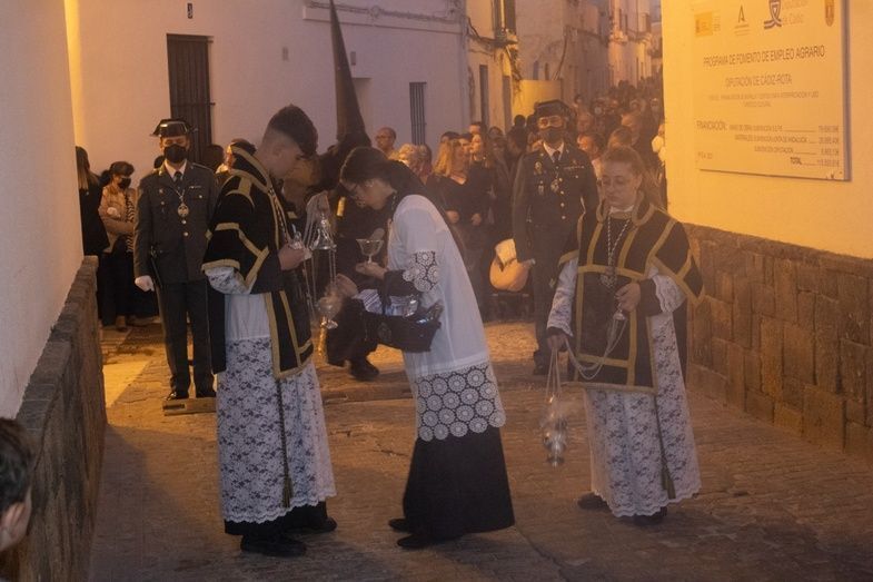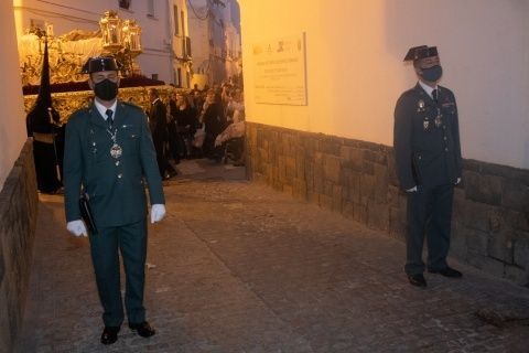 Los roteños y muchos turistas que están en estos días en Rota, pudieron ver un cortejo de hermanos penitentes portando cirios, varas e insignias y representantes de otras hermandades de la villa con quien el Santo Entierro comparte hermanamiento o sede canónica, arropando el discurrir de Cristo en el lecho mortuorio y su madre al pie de la cruz, ambos escoltados por la Guardia Civil, cuerpo que es hermano honorario de la hermandad y que, como ocurre cuando procesionan los agentes de la Policia Nacional o Protección Civil en el caso del Cristo del Amor, dan prestancia y engrandecen la Semana Santa de Rota.