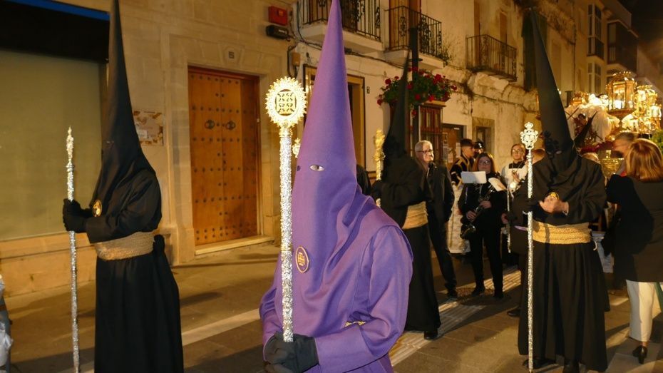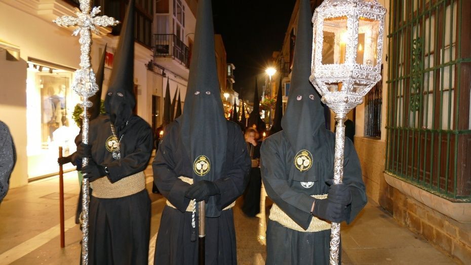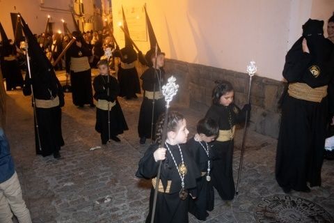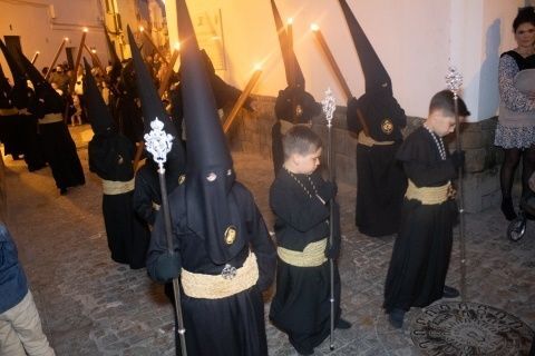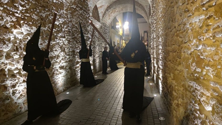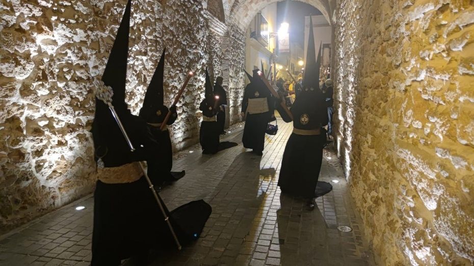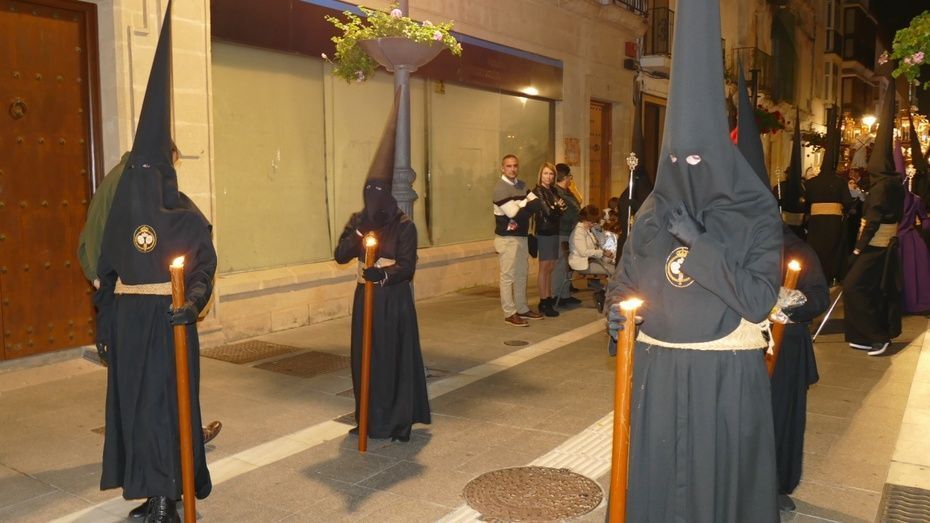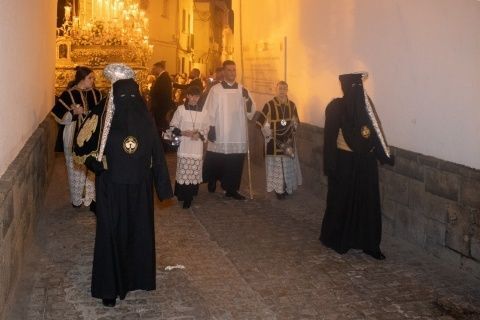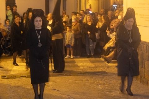 Con el Cristo yacente en la calle desde las ocho de la tarde y Soledad de María Santísima minutos después, esta cofradía se lució como le gusta  hacer, por rincones especialmente emblemáticos como el Arco de la Villa, pero fueron muchos otros puntos del itinerario los que aprovecharon para mostrar su presencia en la calle con un cortejo formado por unos 200 hermanos en total, sumando penitentes, costaleros y mujeres de mantilla. Especial relevancia tiene en esta hermandad  la presencia femenina no solo por ir en el cortejo luciendo la mantilla española, de luto, sino como parte de los hermanos que visten la túnica o como costaleras del paso de Cristo. Un año más, como decía en los días previos el hermano mayor, Juan Antonio Martín, las mujeres destacan en esta hermandad junto a los niños que forman la cantera de la que debe nutrirse para continuar su labor en el futuro.