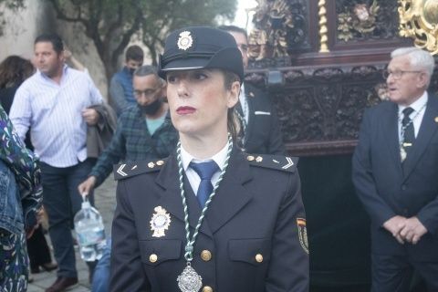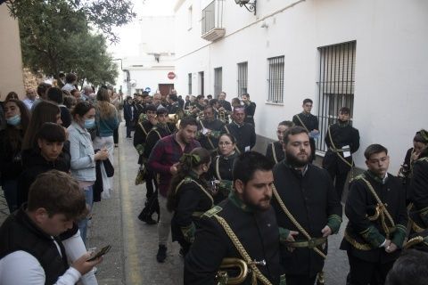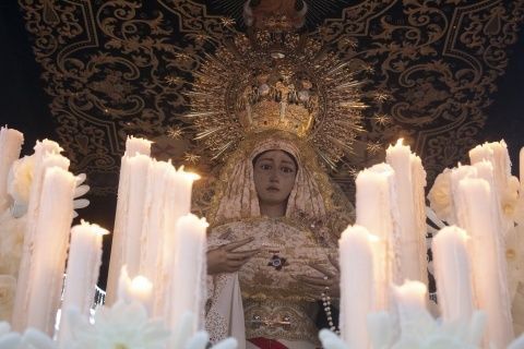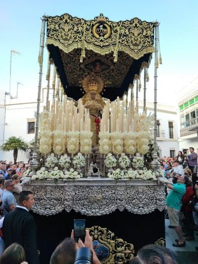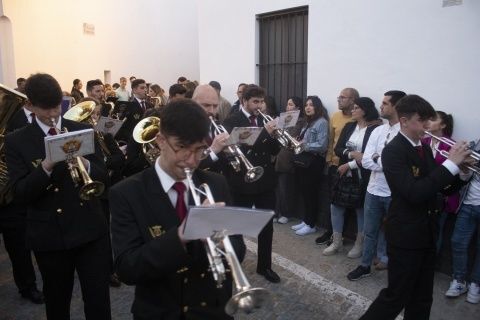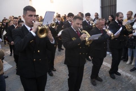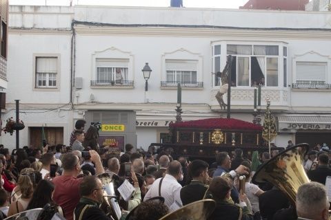 Los sones de la Banda de Cornetas y Tambores de la Asociación Musical "Entre Azahares", de Dos Hermanas, con el paso de misterio, y la Banda Municipal de Música de Lora del Río con la virgen, dejaron momentos muy bonitos como el de plaza de Andalucía donde la cuadrilla de costaleros se lució.