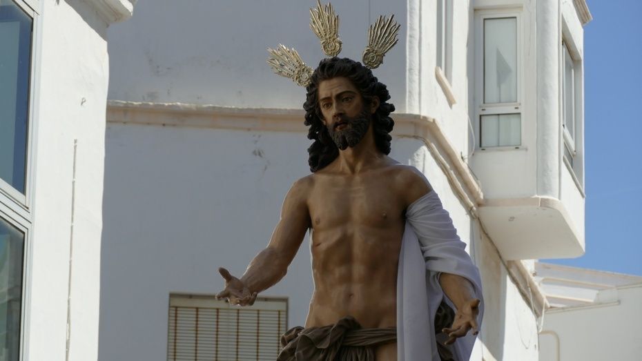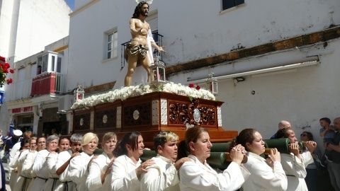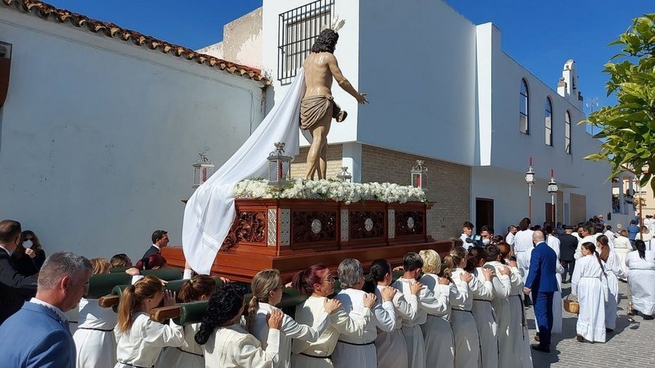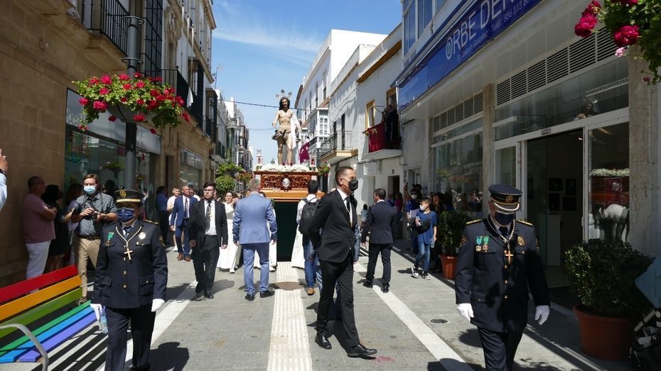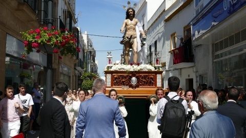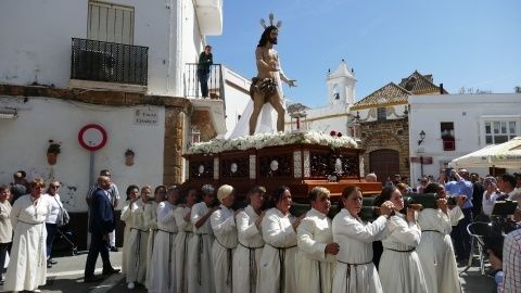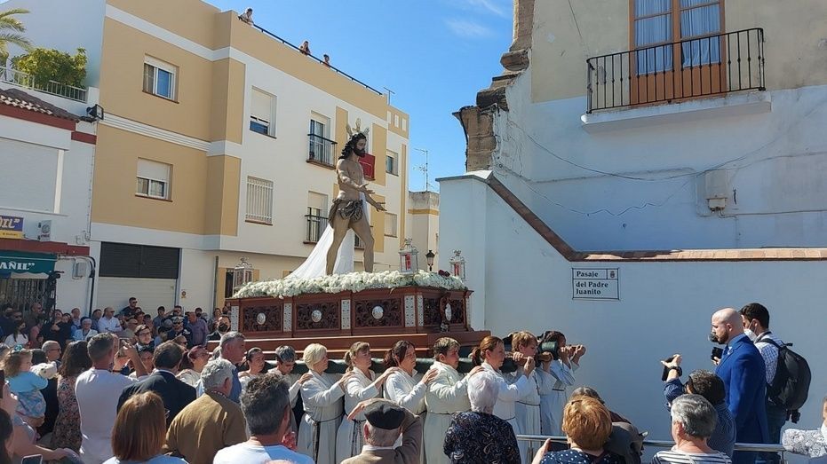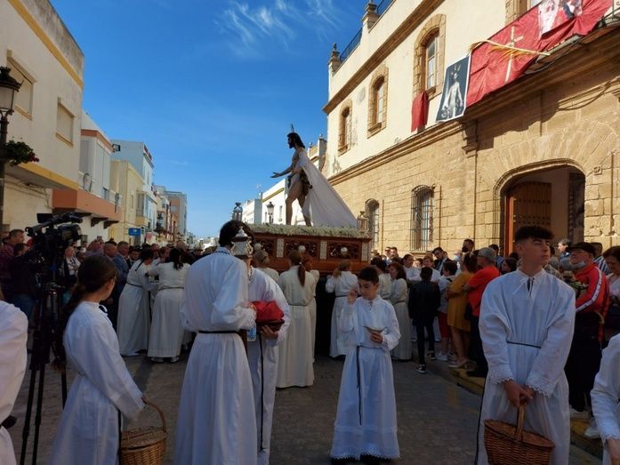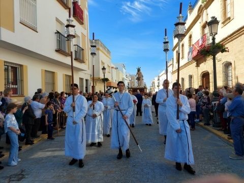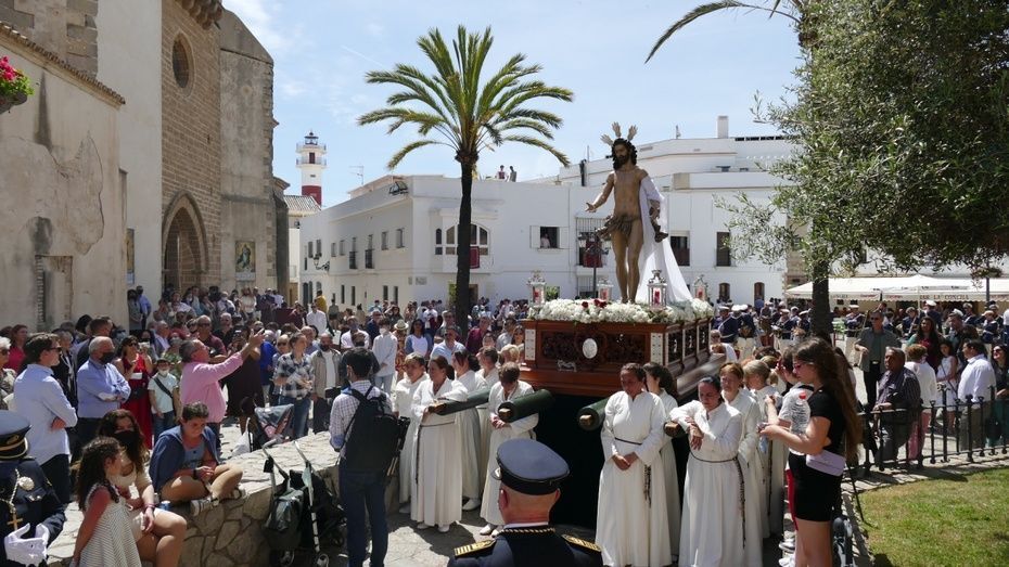 Las cargadoras de la Hermandad del Amor, que el Lunes Santo se quedaron con la pena de no poder procesionar por la lluvia para llevar a su Esperanza del Calvario, llevaban hoy a Nuestro Padre Jesús Resucitado con esfuerzo, con mucho calor, pero con el buen hacer que les caracteriza y recibiendo en algunos momentos del recorrido palabras de ánimo conscientes el público de que las altas temperaturas estaban haciendo aún más duro el procesionar del paso. A las órdenes de Sergio Laynez Bejarano y al son de la Banda de Cornetas "Alfonso X El Sabio" de El Puerto de Santa María, han recorrido las calles desde la parroquia de Nuestra Señora del Carmen hasta el casco histórico, por donde se ha congregado un mayor número de ciudadanos para despedir esta Semana Santa que dice adiós con un sol de justicia que tiene a medio pueblo en las calles viendo el paso y al otro medio disfrutando de la playa.