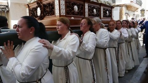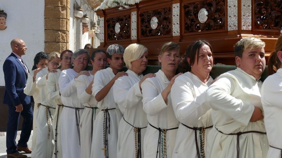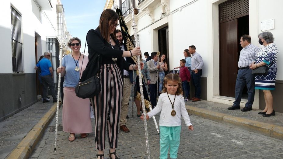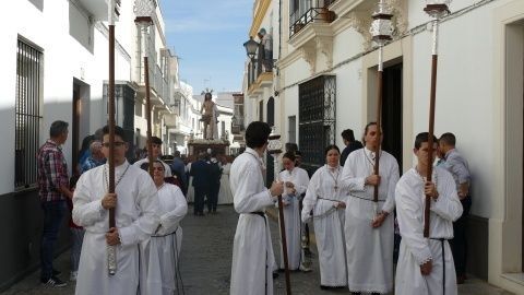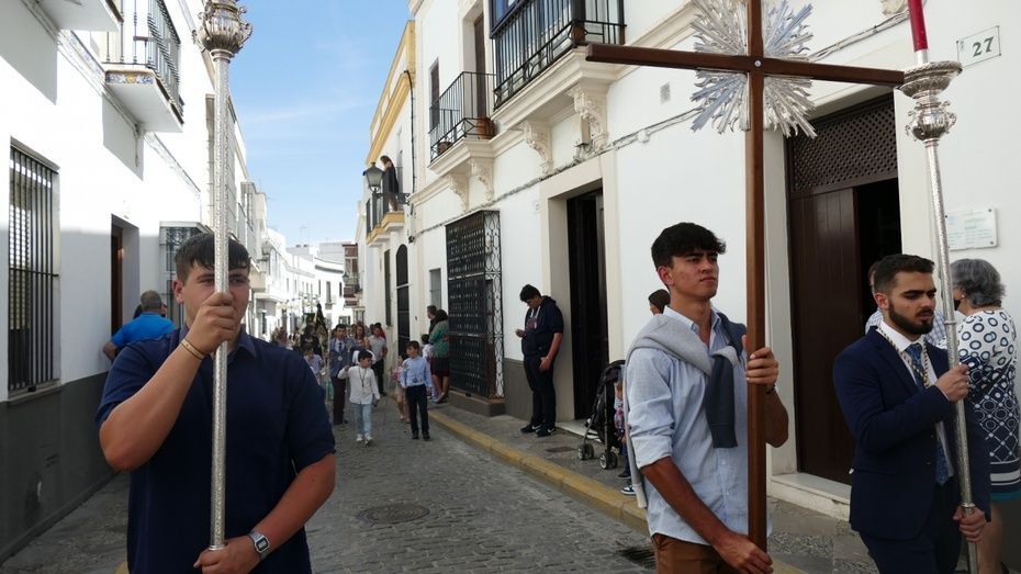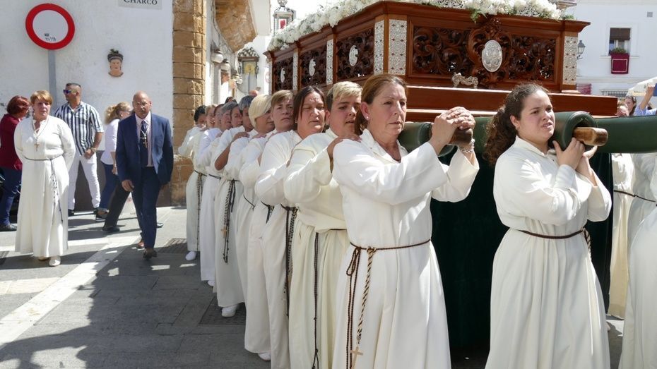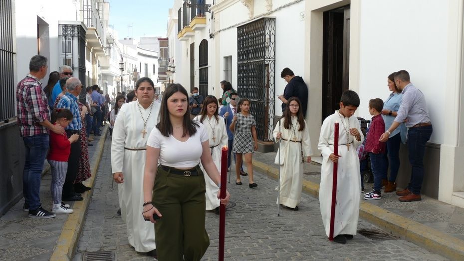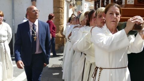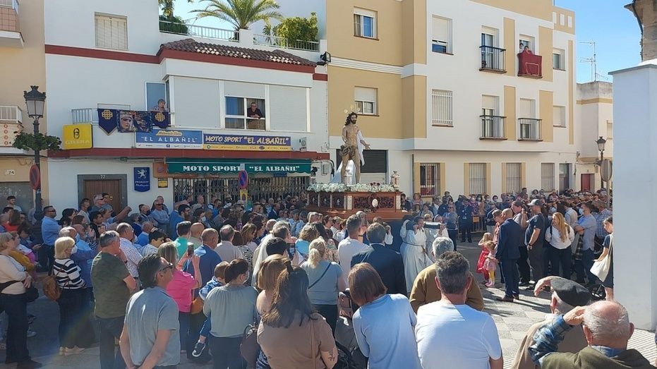 Las cargadoras de la Hermandad del Amor, que el Lunes Santo se quedaron con la pena de no poder procesionar por la lluvia para llevar a su Esperanza del Calvario, llevaban hoy a Nuestro Padre Jesús Resucitado con esfuerzo, con mucho calor, pero con el buen hacer que les caracteriza y recibiendo en algunos momentos del recorrido palabras de ánimo conscientes el público de que las altas temperaturas estaban haciendo aún más duro el procesionar del paso. A las órdenes de Sergio Laynez Bejarano y al son de la Banda de Cornetas "Alfonso X El Sabio" de El Puerto de Santa María, han recorrido las calles desde la parroquia de Nuestra Señora del Carmen hasta el casco histórico, por donde se ha congregado un mayor número de ciudadanos para despedir esta Semana Santa que dice adiós con un sol de justicia que tiene a medio pueblo en las calles viendo el paso y al otro medio disfrutando de la playa.