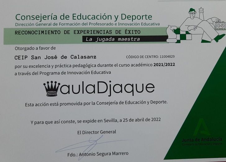 Este centro educativo lleva participando en el programa "aulaDjaque" de la Consejería de Educación desde que se creara el programa en el curso 2017/2018, siendo este el primer curso en el que la Dirección General de Formación del Profesorado e Innovación Educativa ha querido reconocer a algunos de los centros andaluces que participan en él por sus buenas prácticas y experiencias de éxito, entre ellos, el San José de Calasanz.