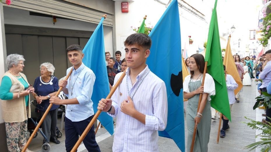 Es una procesión muy participativa como se ha podido ver por el amplio cortejo que la acompaña y que va desde los pequeños y revoltosos angelitos del ciclo de Infantil del colegio Salesianos, a las niñas de mantilla y de calle de los primeros cursos de Primaria, los más jóvenes portando las banderas salesianas, los niños que este año han tomado su Primera Comunión, una representación del grupo scouts "Santo Domingo Savio", antiguos alumnos y antiguas alumnas, algunas de mantilla, representación de las asociaciones de María Auxiliadora como la ADMA Salesianos y ADMA Salesianas, así como la directiva de los dos colegios salesianos de la localidad y los seises. En total, más de 200 personas que han dado color y han animado las calles del casco histórico desde que partiera a las seis y media de la tarde.