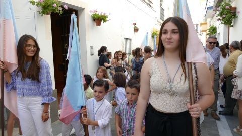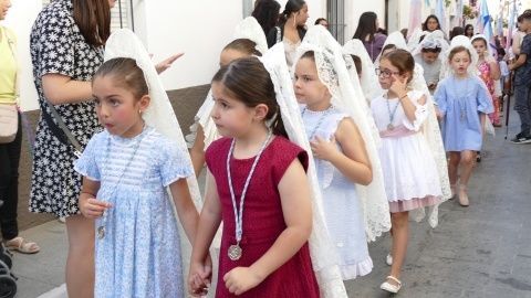 María Auxiliadora se ha lucido hoy por las calles y hasta su recogida, más tarde de lo habitual, ha estado arropada por un largo cortejo en el que han estado presentes los alumnos del centro, desde los más pequeños, algunas vestidas de flamenca, las de mantilla, los que iban de calle con varas y banderas, la representación de ADMA Salesiana, mujeres de mantilla, niños que han recibido este año la Primera Comunión, representación de algunas hermandades locales, AMPA, Salesianos Cooperadores, la presidencia del colegio de las Salesianas.