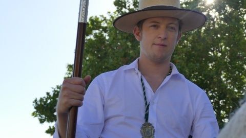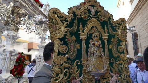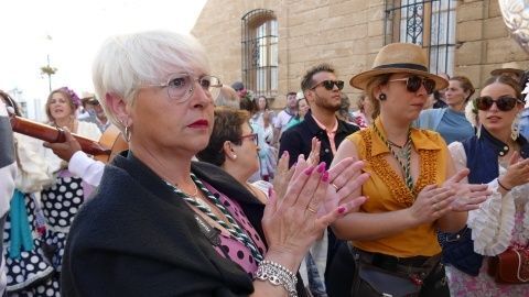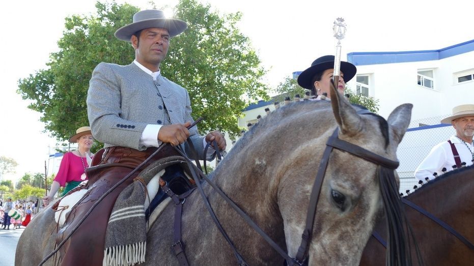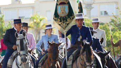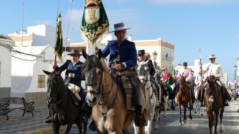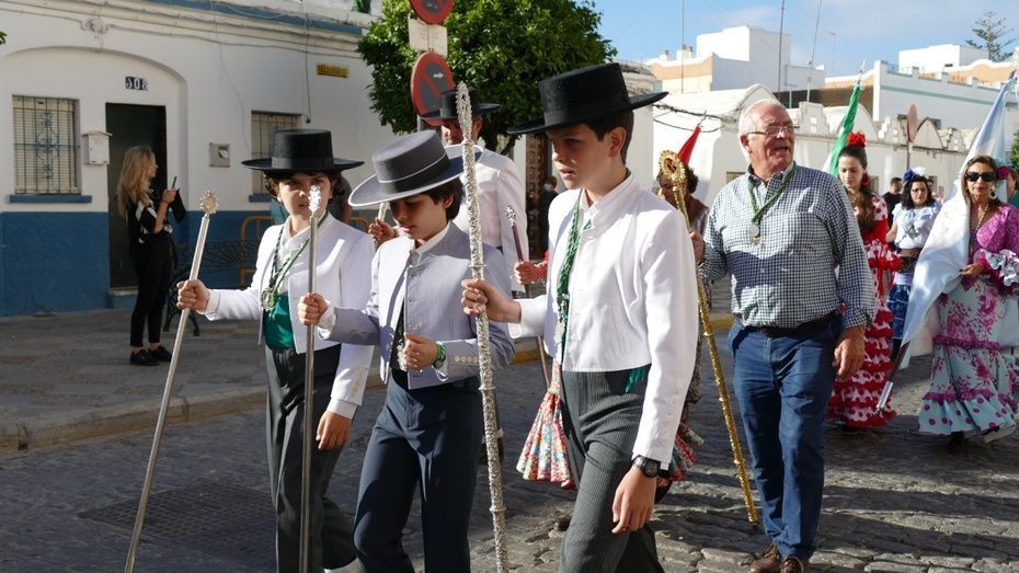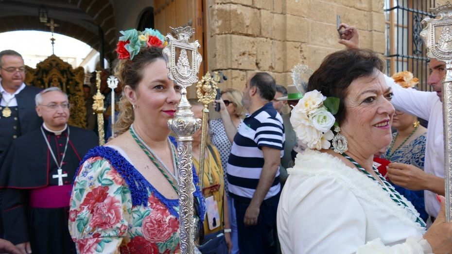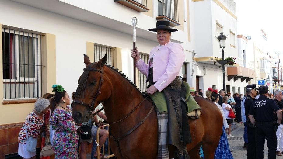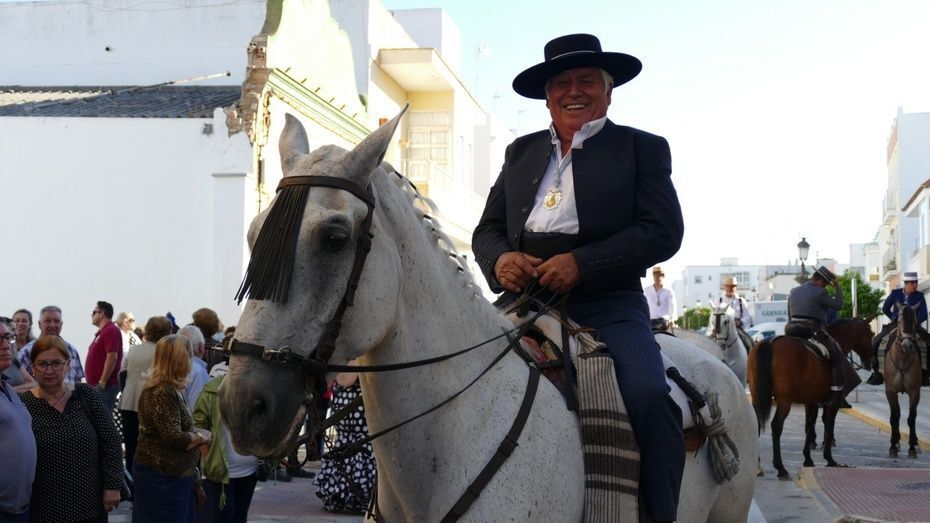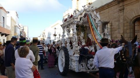 Con la eucaristía terminada, los rocieros iban formando el cortejo a las puertas de la parroquia. Llegaban los caballos a modo de representación de casi el centenar de animales que embarcarán desde Rota en Sanlúcar esta misma tarde, y los hermanos iban distribuyéndose para formar un cortejo en el que se han lucido varas e insignias arropando a la carreta blanca que porta el Simpecado. Una carreta engalanada para la ocasión que recorrerá las arenas hasta que el jueves por la noche llegue a la casa de hermandad de Rota en el Rocío.