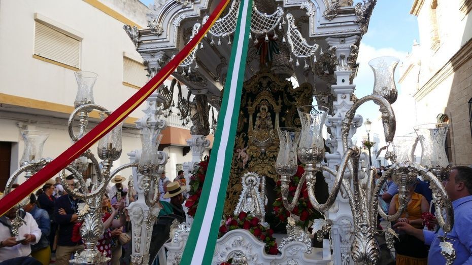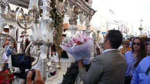 La única parada que se ha mantenido pese a los cambios en la salida, ha sido la de la barriada la Blanca Paloma donde se ha realizado la ofrenda floral ante la pequeña imagen de la virgen del Rocío en los jardines. Con el rezo de una oración y el ramo de flores a sus pies, se vivía uno de los momentos más emotivos dedicados al roteño Manuel Beltrán de la Rosa, el herrero municipal que en el mes de abril sufrió un accidente laboral que lo ha dejado de momento convaleciente. Manuel es un buen rociero y este año, por cuestiones de lógicas, no podrá estar en el Rocío pero su hermandad ha querido tener un detalle con él entregándole un cuadro enmarcado con el cartel anunciador de la romería de este año, y dedicándole un par de letras. Su familia y el propio Manuel han llorado de emoción y alegría por este gesto.
