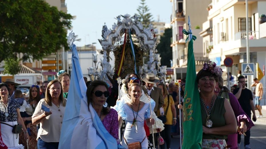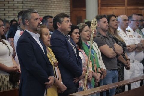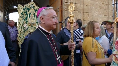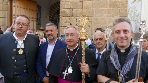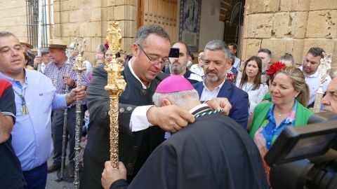 Antes de empezar el camino, el hermano mayor Rafael Caraballo ha impuesto la medalla de la hermandad roteña al obispo, y el alcalde de Rota, Javier Ruiz, junto a concejales de la Corporación que han estado en la misa, ha hecho entrega de un ramo de flores para que vaya en la carreta.