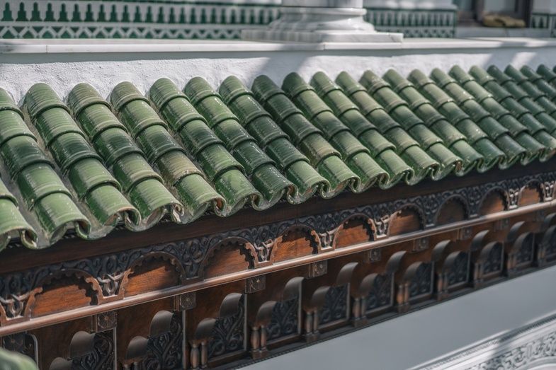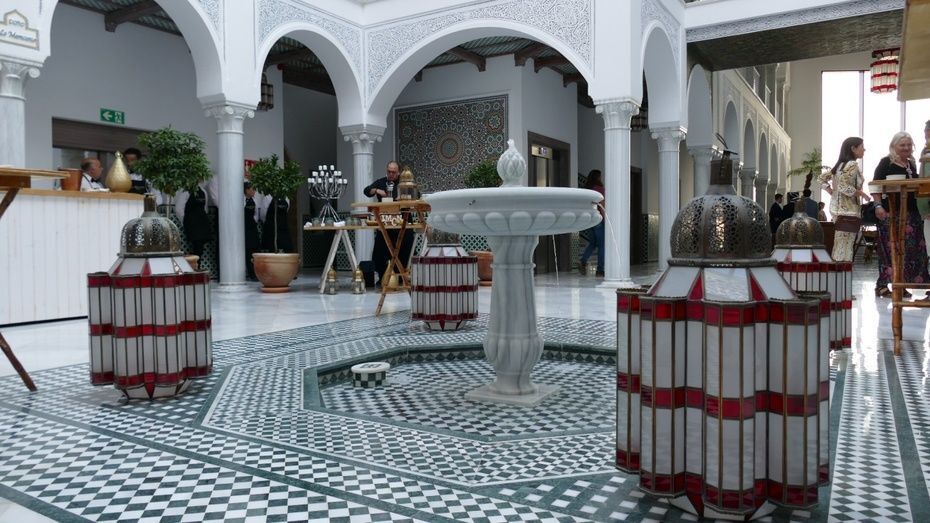 Lámparas realizadas en cristal rojo Irak que son réplicas exactas de La Mamounia, algunas de 1,80 metros de altura; zócalos formados por mosaicos con más de un millón de piezas colocadas una a una; 82 columnas de mármol de Macael; un mosaico en la entrada con casi 14.000 piezas; artesonado realizado en madera maciza de cedro de Marruecos y en madera de la cordillera del Atlas, tejas marroquíes elaboradas artesanalmente; las barandas, realizadas por el conocido escultor escocés David Marshall o piedra ostionera encontrada durante la obra y reubicada como parte de la decoración de algún apartamento, son algunos de los múltiples detalles que dan la bienvenida al viajero.
