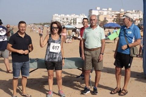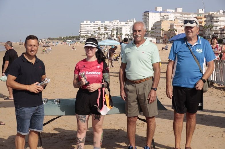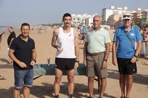 Concluido el recorrido, el delegado municipal de Deportes, José Antonio Medina, junto con el presidente del club Peña Dosa Atletismo, José Lobato, han participado en la entrega de trofeos del Recorrido Atlético 'Playas de Rota' que se ha celebrado en la meta, en plena playa de la Costilla.