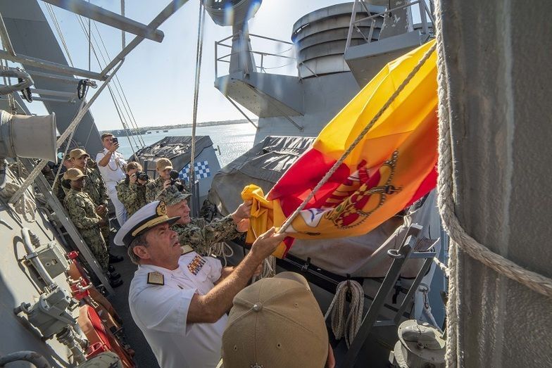 La ceremonia marítima exige que los buques de guerra en puerto extranjero icen una bandera a modo de cortesía hacia el país anfitrión, por ello, a la llegada del destructor el encargado de izar las banderas fue Mike M. Gilday, almirante jefe de operaciones navales de la US Navy, un cargo equivalente al almirante jefe de Estado Mayor de la Armada española. En el acto estuvo presente el almirante de la flota, Eugenio Díaz del Río, previo al rendir honores con este gesto protocolario ambos almirantes jefes mantuvieron una distendida reunión.
