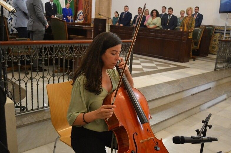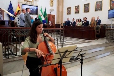 El acto finalizaría con música, con la fantástica interpretación de los himnos de Andalucía y España por la talentosa violonchelista roteña, Andrea Griffin, para poner la guinda del pastel de un acto institucional considerado una declaración de amor de Rota a Almudena, quienes se funden en un beso inmortal arropado por sus vientos.