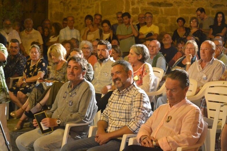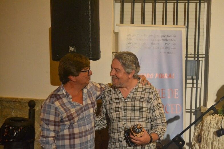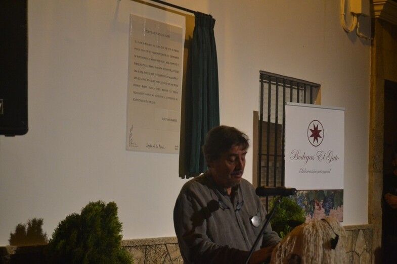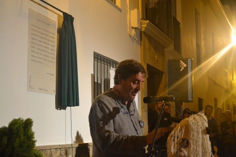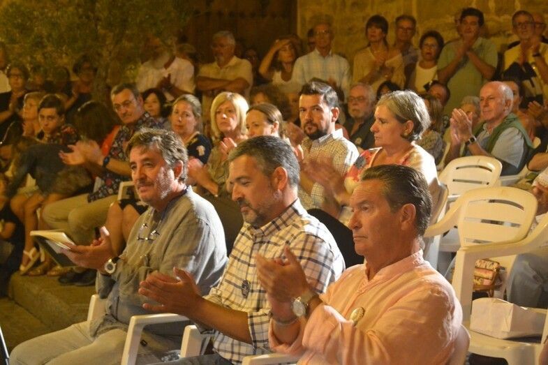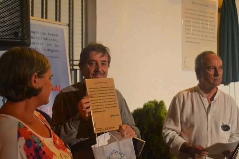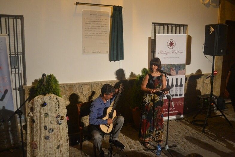 Una vez descubierta y entregada la cerámica, Cristina Bayón (soprano) y Jesús Pineda (guitarra), ambos recibieron un obsequio por su desinteresada actuación, interpretaron un poema alemán que concluyó con “si amas por el amor, oh, sí, ámame siempre”, en un nuevo alegato sobre amar por amar, lejos de la vinculación de este a lo perecedero o a la posesión. El acto mantenía un ritmo avanzado, se estaba cumpliendo con los plazos marcados al comienzo. El público despertó con el descubrimiento del azulejo y quedó sorprendido con la interpretación de la soprano y el guitarra. Una agradable noche de final de verano arropaba un acto en el que Prudente Arjona hizo entrega de dos figuras artesanales elaboradas por él mismo, y con materiales reciclados a Luis García Montero.