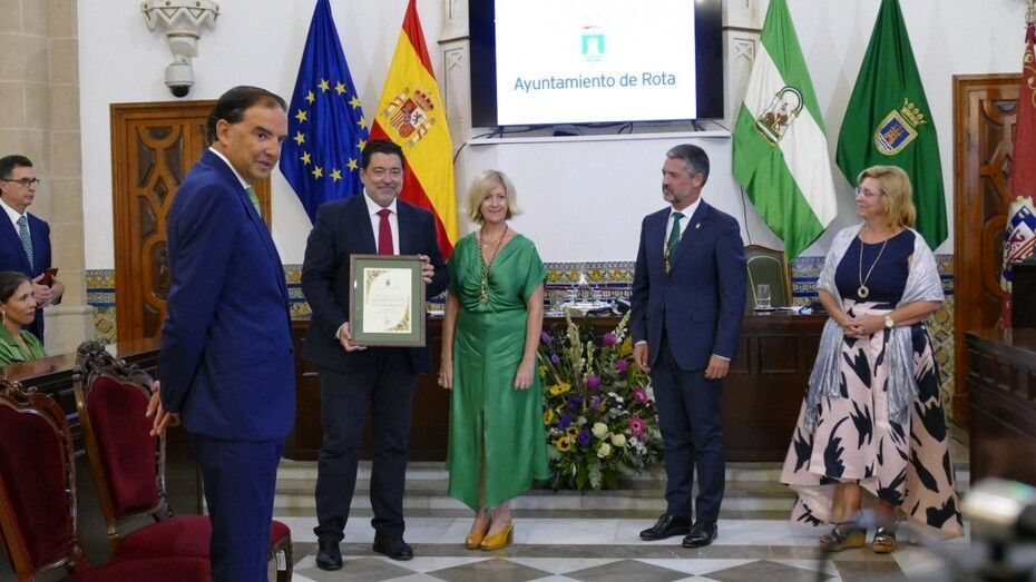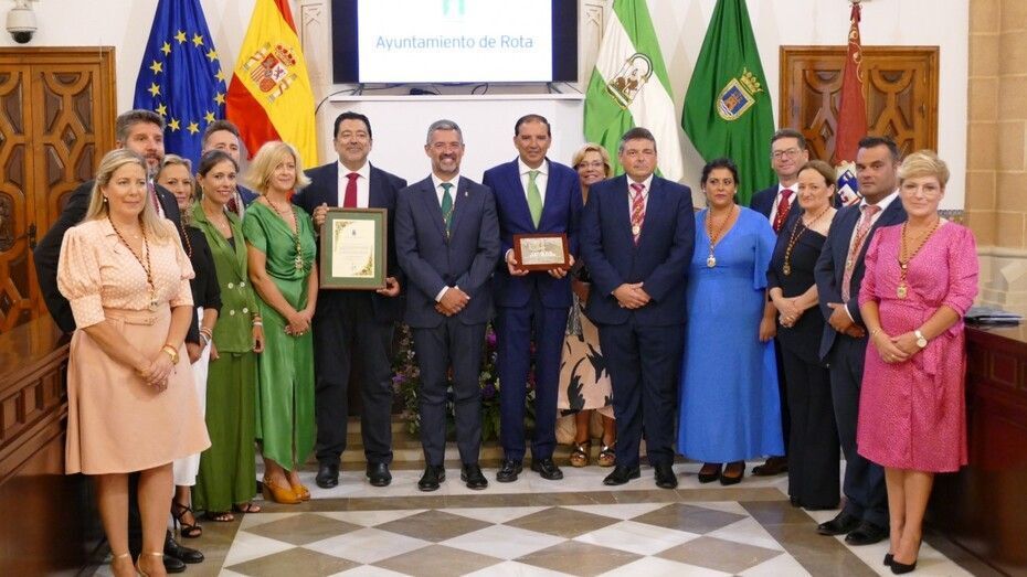 El alcalde de Rota, Javier Ruiz, ha presidido este acto en el que han estado presentes los miembros de la Corporación municipal, el nuevo delegado territorial de Medio Ambiente, Sostenibilidad y Economía Azul, Óscar Curtido, el comandante de las Actividades Navales de EEUU en España, Teague Juárez, el almirante del Arsenal de Cádiz, Ricardo Hernández, representantes de la cadena pública, y miembros de la Orden de la Urta de Oro además de ciudadanos en general.