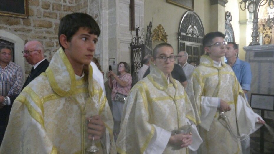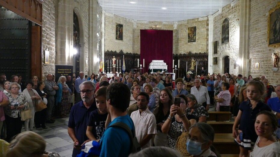 Tras la misa de las ocho y media de la tarde, con una iglesia llena de fieles, miembros de la comunidad parroquial "Stella Maris" de la iglesia de Nuestra Señora del Mar, han tenido el honor de ser este año los encargados de llevar a cabo el traslado de la virgen en su peana desde la capilla en la que se le puede visitar todo el año, hasta la parte principal de la parroquia de la O. La precedía el cuerpo de acólitos abriéndole paso en el breve recorrido por la nave central de la iglesia hasta llegar a un pequeño altar situado en el centro.