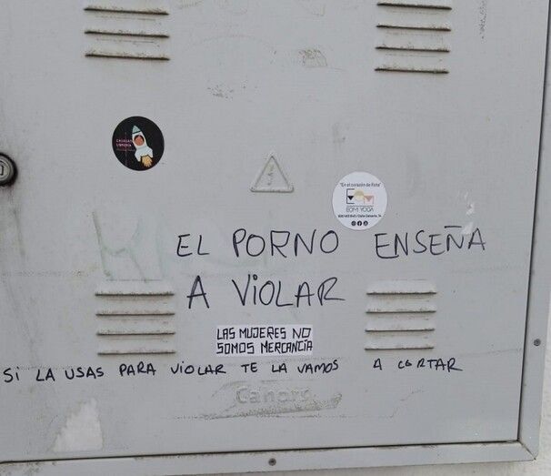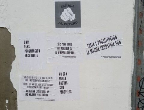 [Img #177278]Además, en algunas otras zonas y en paneles informativos, se han colgado carteles donde se lee "nuestras hijas no quieren ser putas", "el porno enseña a violar", "si la usas para violar te vamos a cortar...", "trata y prostitución la misma industria son", "no son sugar daddys, son pedófilos" o "señala al putero".
